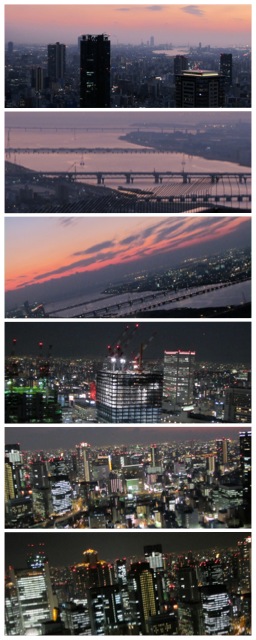 從地鐵站沿路去梅田天空之城,到登上瞭望台之後給我的感覺很奇妙,沿路經過的都是一個一個的建築地盤,如雨後春筍的新商業區,俯瞰整個大阪除了海闊天空之外,城內的建築人車從四面八方的來往,看著鐵路列車在繁忙車站有序出入,人車爭路加上五光十色的高樓大廈,看起來根本就像一個巨型的城市模型,我一直目不轉晴看著列車出入呢!