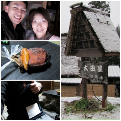回大田屋的途中看到有剷雪車準備出動了,修理合掌屋的工人們也趕工,我看到他們“僭建”出來的房間還沒有蓋上屋頂,難為工人在大雪下開工,回到大田屋,大田媽馬上叫我去地爐旁取暖,喝一口熱茶、吃塊綠茶餅,還要從地爐頂的木板上拿柿乾送給我,臨走時又給我一包暖包貼在身上