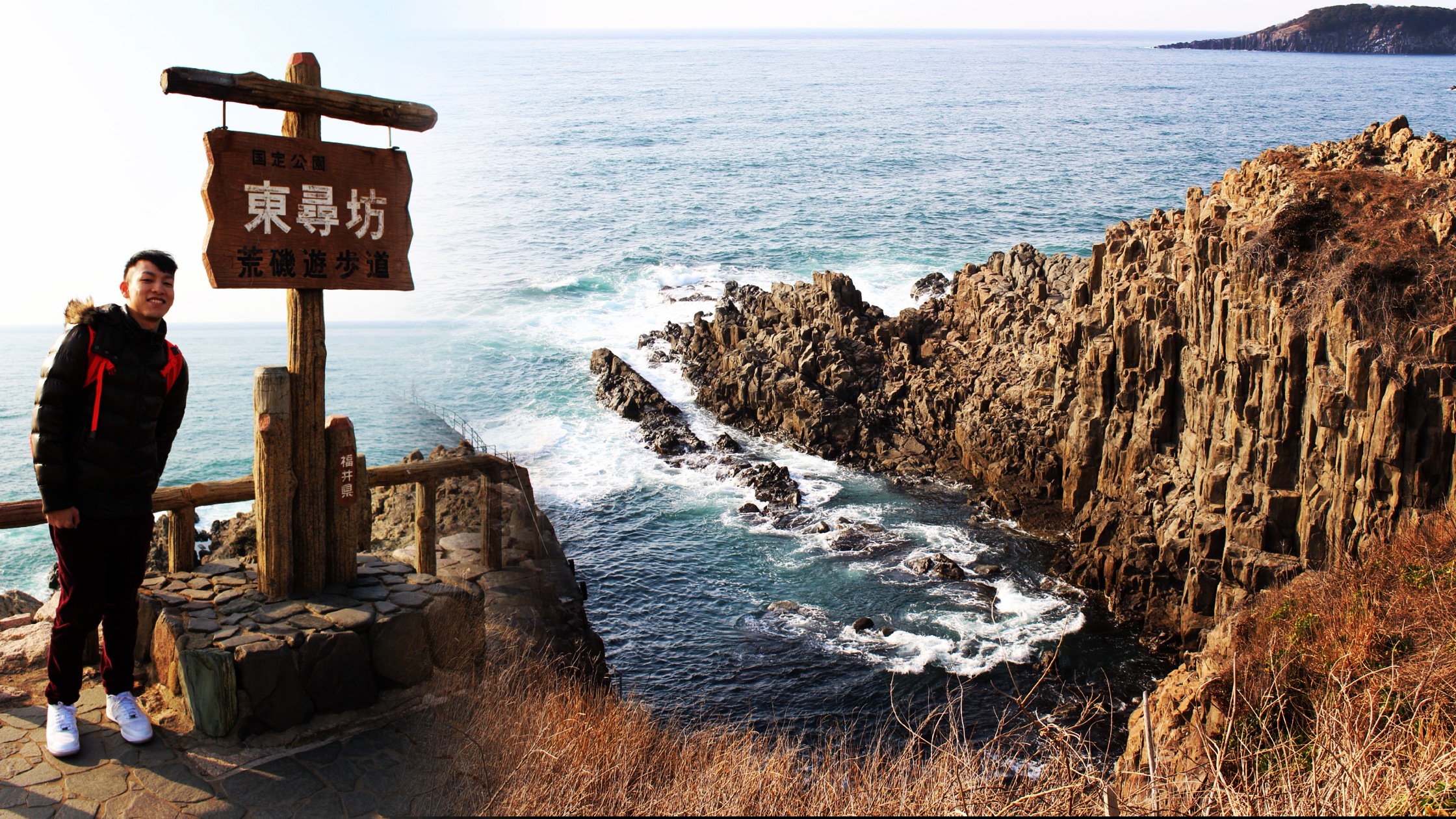 屬於越前加賀國定公園的東尋坊,位於日本福井縣北部,是與石川縣相鄰的日本海沿岸的一處山岩峭壁,受經年累月的海蝕作用而形成懸崖峭壁,從崖壁斷面可見到清晰的安山岩柱狀節理,如此規模的地理景觀目前在全世界只有三處,另兩處在朝鮮的金剛山及挪威的西部海岸。長達一公里多的東尋坊,被指定爲國家級天然紀念物,附近還有雄島等名勝地以及安山岩的奇岩怪石等景點。東尋坊一帶除了有一個地理景觀獨特的海崖之外,還有商店街、海鮮街、東尋坊塔等,是當地發展成熟的旅遊景點。