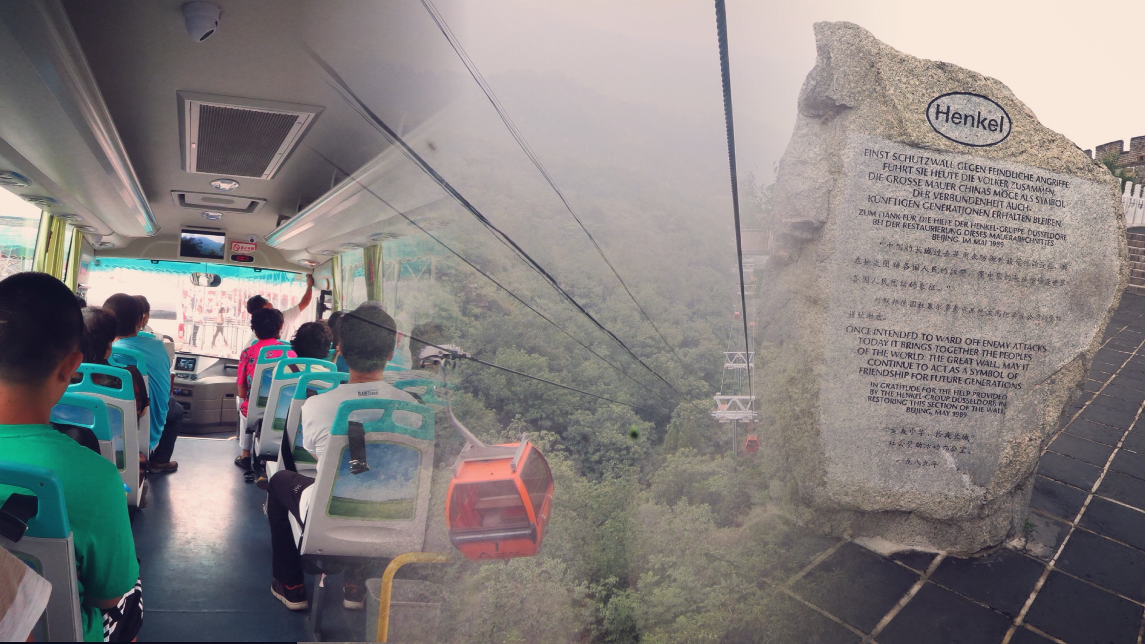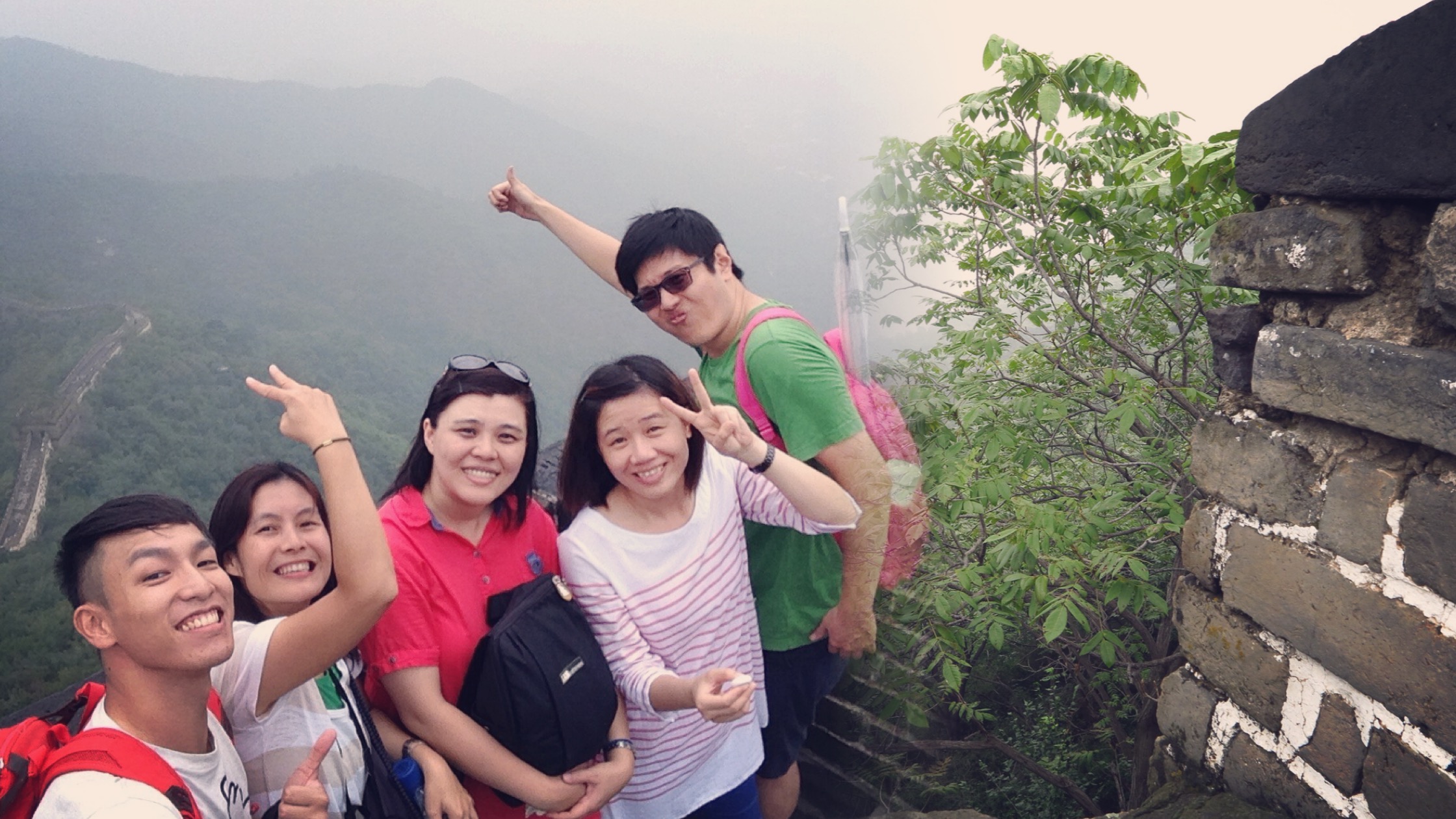 首先坐接駁公車到纜車站,載到山峰上的長城入口,走幾步就可以站在長城上了,節省爬上去的腳力,經過一座又一座的敵樓,群山環抱的長城風景秀麗,又有一點雲霧,加上天氣陰涼並不酷熱,幸好也沒下雨,吹著涼風真的好舒服唷!在長城的敵樓裡,一個人坐在台階啃麵包、零食,當下真的很享受、也很幸福的一刻,蠻諷刺的是想起以前的古人發配邊彊來到地勢險要的山巒興建長城,絕對刻苦耐勞啊!要記得快樂是建築在別人的痛苦之上…還有一點就是長城雖然設有垃圾桶,可是我心想垃圾總會要運到山下的,所以有垃圾的還是請自己帶走吧,參觀別人的地方也要保護環境唷!