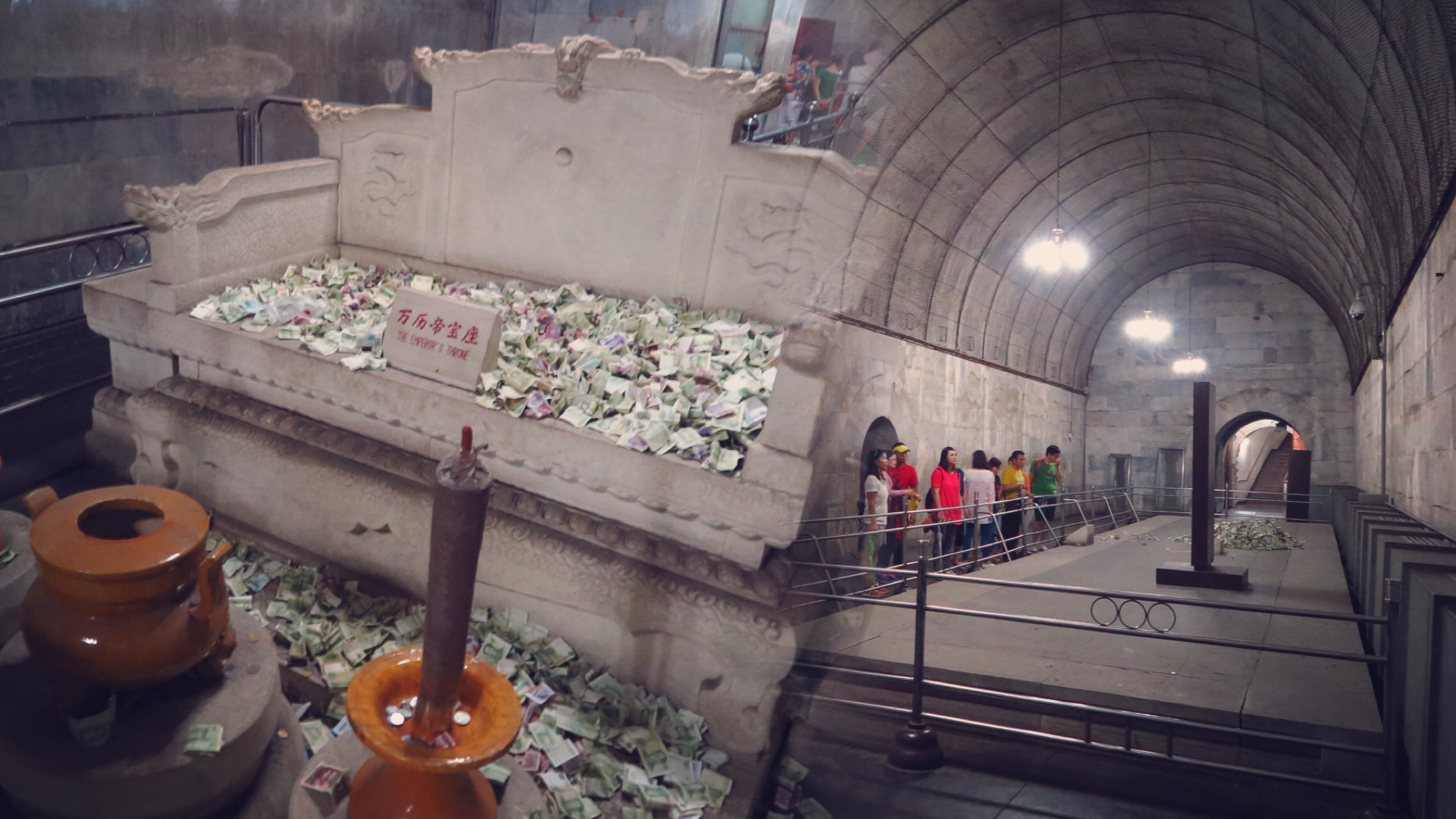 「你在裡面拍照,不怕有鬼嗎?」我朋友問我一句讓我醒覺,呀~是唷,這是陵墓,是死人的安寢之所,與掃墓拍照的行為有點雷同,心生微微的內疚@.@。說實話,我是抱著到此一遊的心態,本來就沒有很大的期待,到地宮走一轉之後也沒有什麼特別的感覺,漢白玉龍椅都被摸到變漢「黑」玉,想說幾百年的文物會怎麼兒戲嗎?回來之後看了相關發掘定陵的歷史記載就覺得好悲哀,原來我看到的紅漆棺槨是複製品,原來的真品卻因為有複製品變成「沒用處」,定陵發掘後棺槨居然遭棄了!只有這些嗎?還不止,萬曆帝后的屍骨呢?