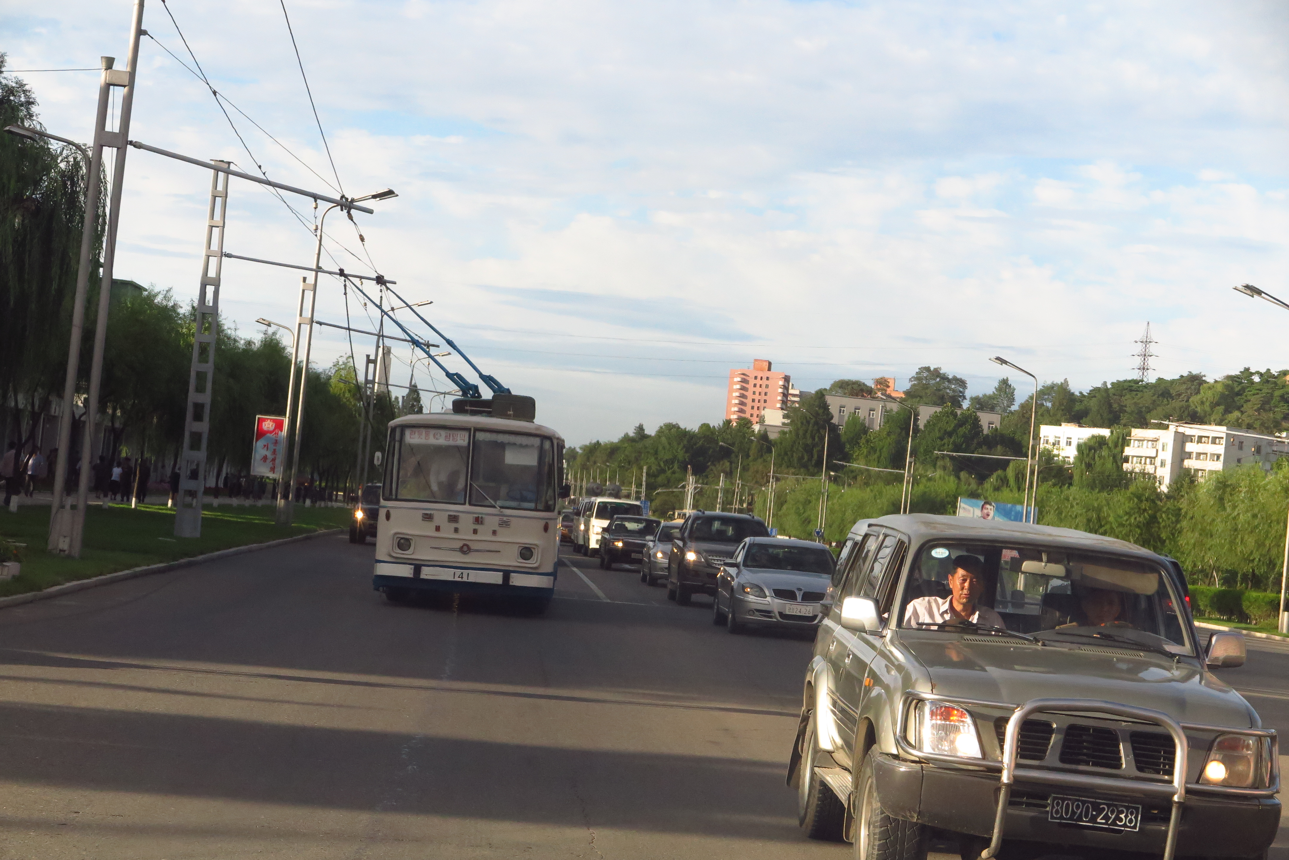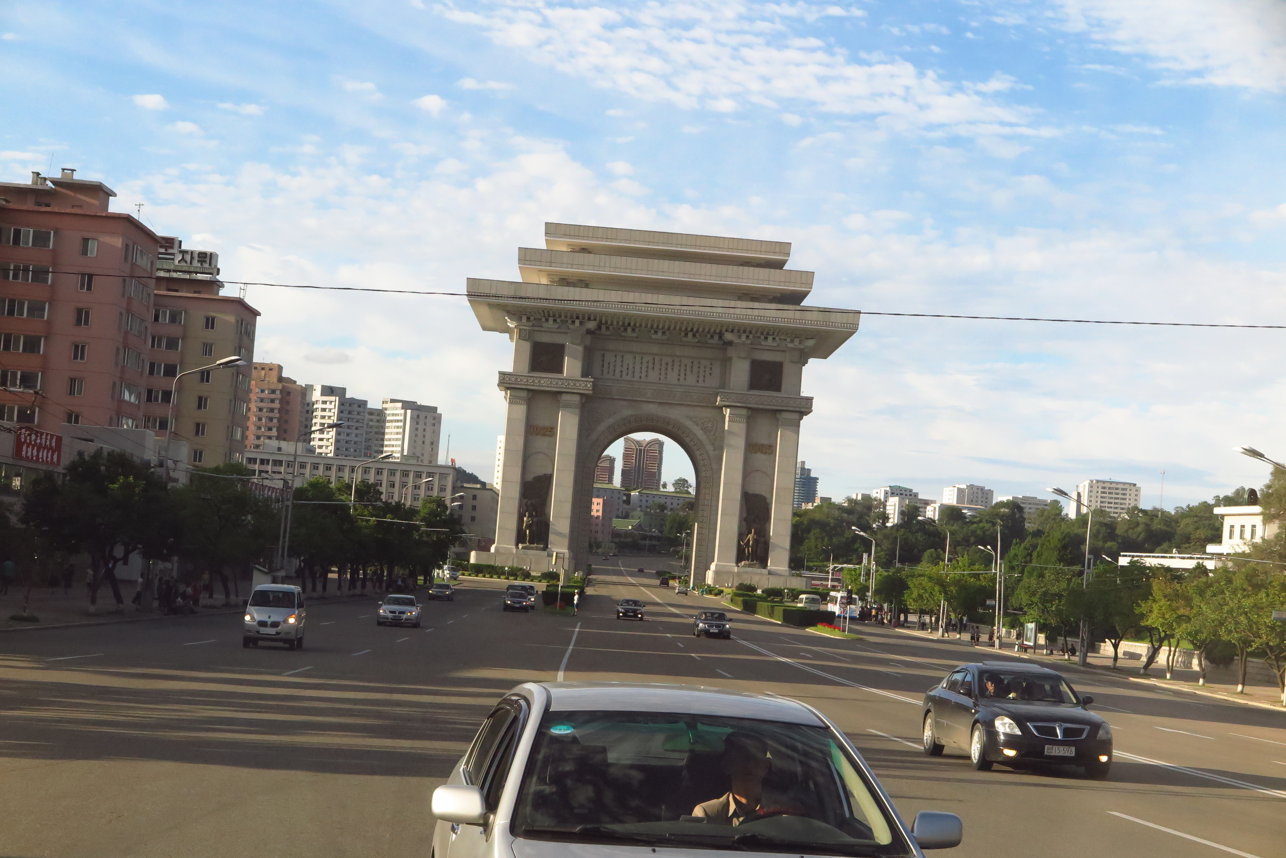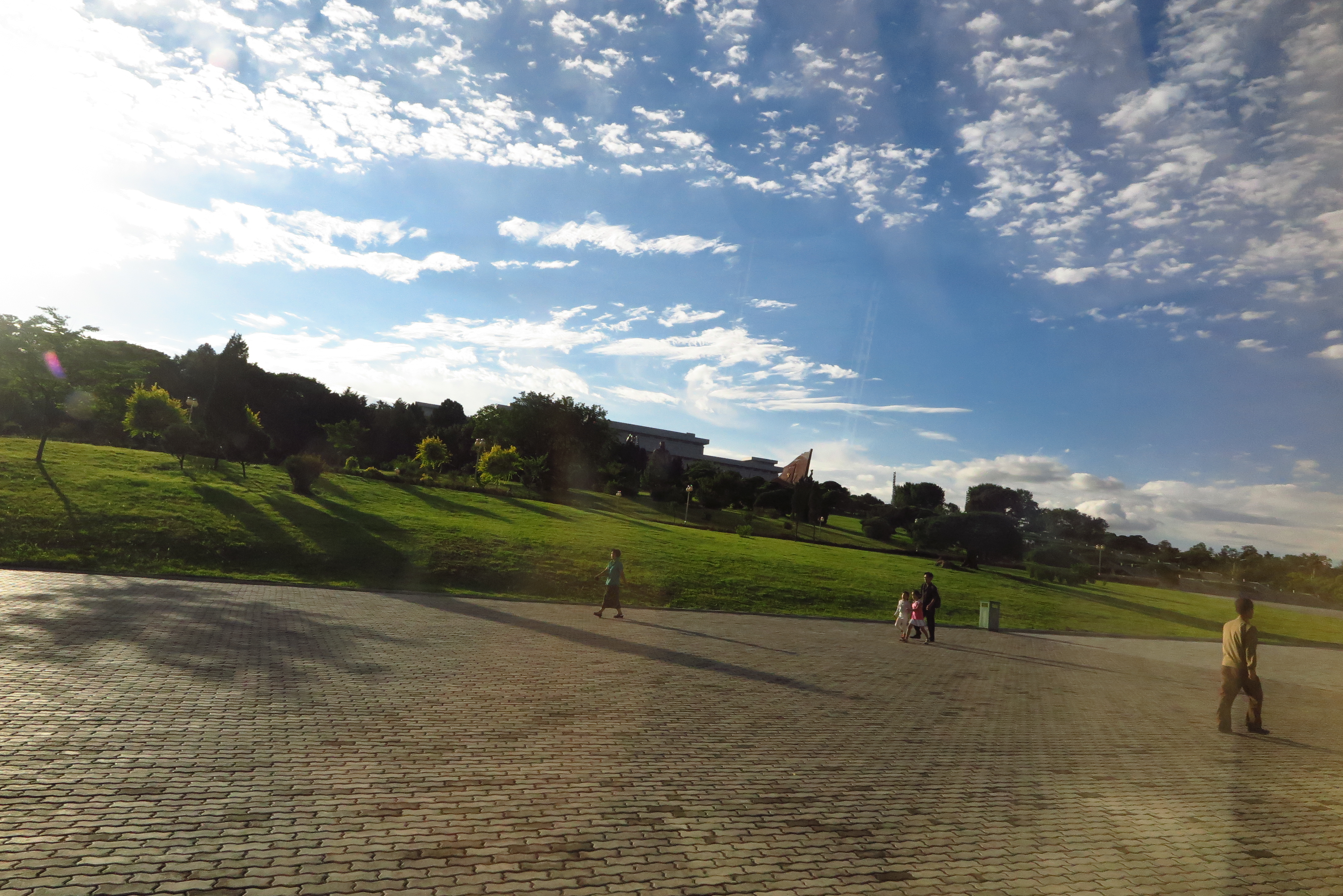 在車上的我坐到最後一排,凝望著窗外,看穿窗外如走馬燈呈現一切北韓的生活情景,從機場到市區,沿途風景逐漸由一片綠野田地,慢慢有一些農村小房子,修整過的花圃、林蔭大道,再到市內一座座大樓、噴水湖畔的城市樣貌;從鄉村走路騎腳踏車的農民、到市內坐公車的上班族、學生等,活生生的北韓人生活,一幅幅的畫面看起來好美!而且四處都非常乾淨,真的一點垃圾都沒有,市容分數絕對能夠給90分以上的,真的很漂亮!果然首都平壤是國家的大櫥窗,總不能失禮外國遊客的。