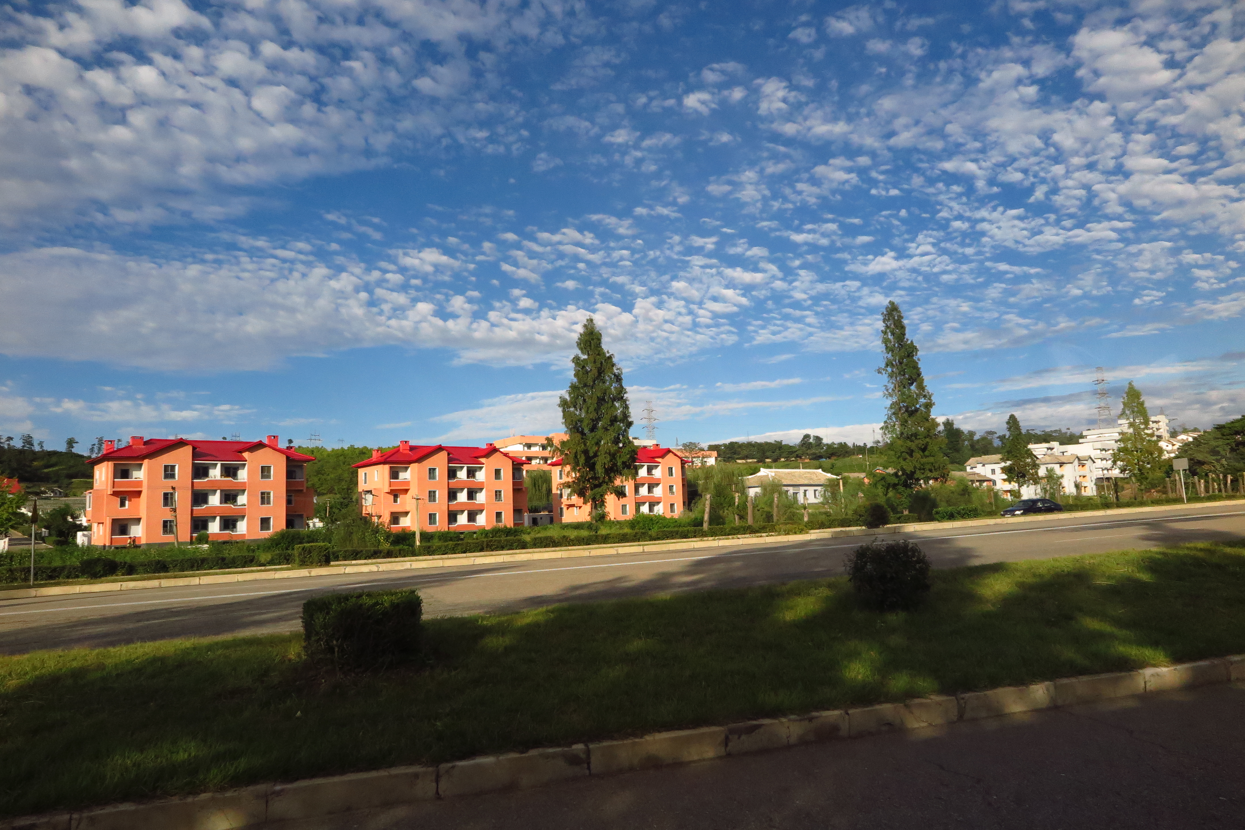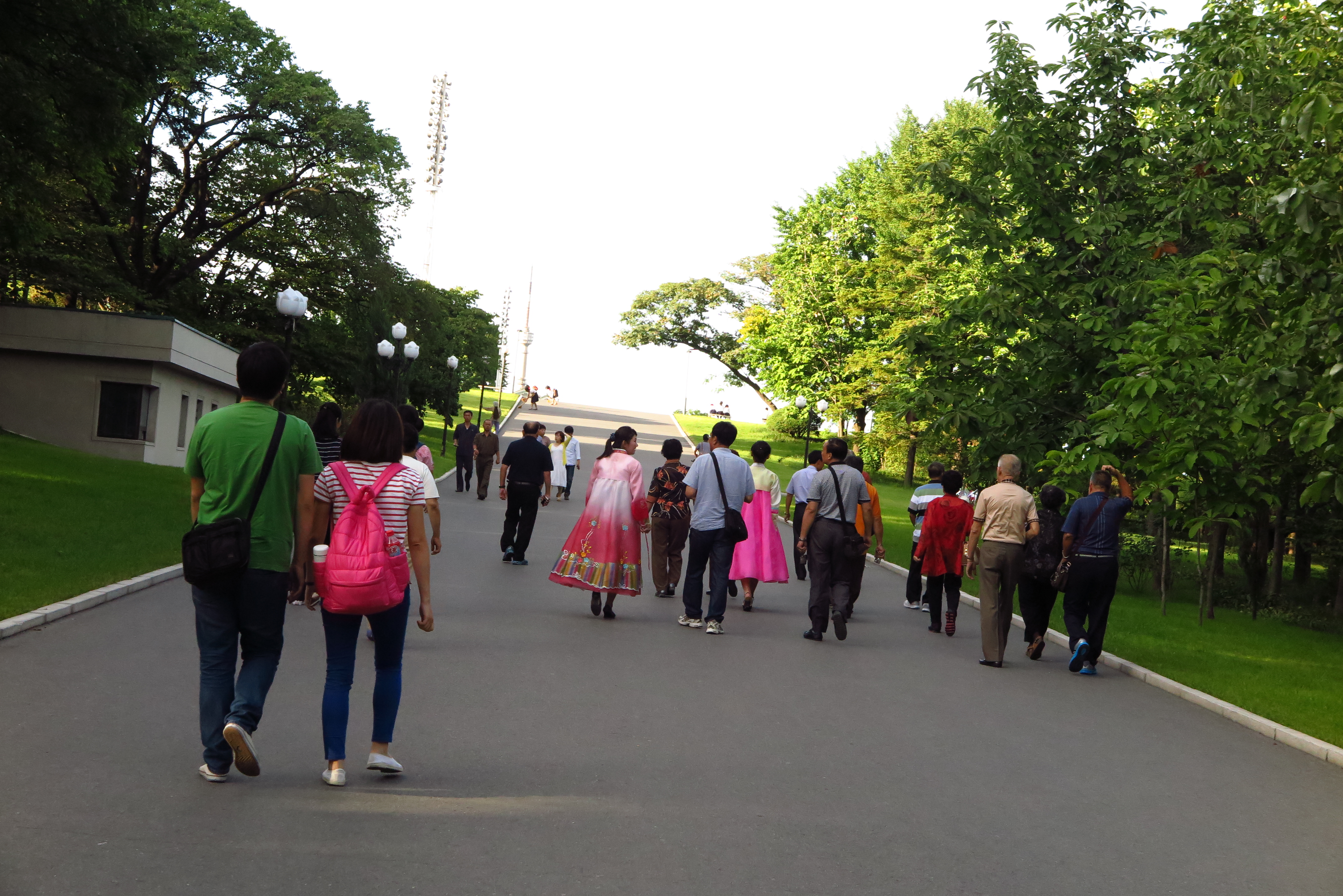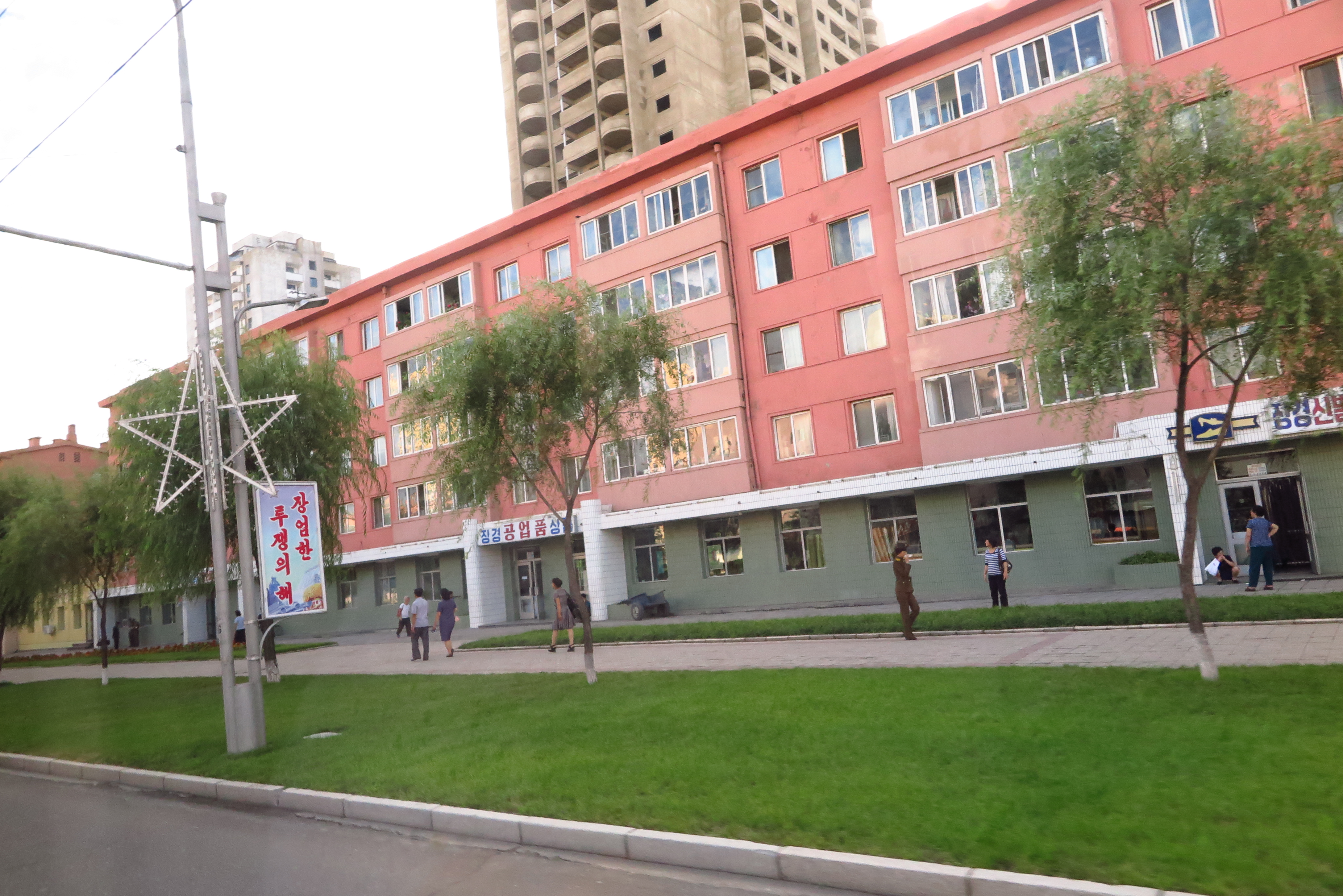 在車上的我坐到最後一排,凝望著窗外,看穿窗外如走馬燈呈現一切北韓的生活情景,從機場到市區,沿途風景逐漸由一片綠野田地,慢慢有一些農村小房子,修整過的花圃、林蔭大道,再到市內一座座大樓、噴水湖畔的城市樣貌;從鄉村走路騎腳踏車的農民、到市內坐公車的上班族、學生等,活生生的北韓人生活,一幅幅的畫面看起來好美!而且四處都非常乾淨,真的一點垃圾都沒有,市容分數絕對能夠給90分以上的,真的很漂亮!果然首都平壤是國家的大櫥窗,總不能失禮外國遊客的。