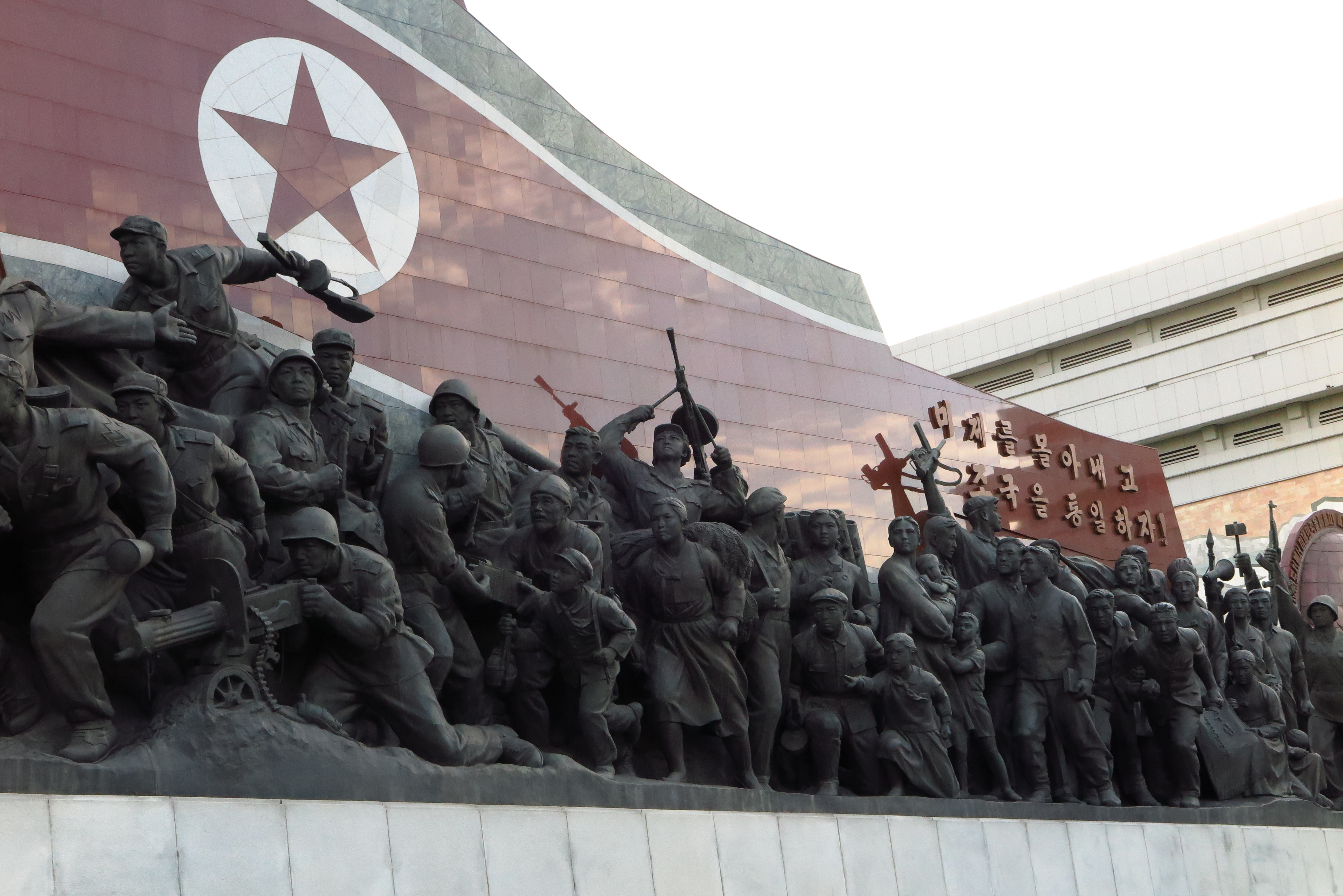 集合十一位團友就上車開往平壤市中心,期間導遊小洪、小徐很親切的以純正普通話介紹自己,沿途一直在介紹自己的國家,我想她應該想把自己的上至天文地理,下至雞毛蒜皮的所有知識告訴我們,務求不會有dead-air的情況,包括國家歷史、景點小資料等,有時候也會疲累到邊講邊睡著,她們還會為我們唱歌娛賓互動一下,有唱過《阿里郎》、《賣花姑娘》甚至中文歌曲《童話》等,歌喉也是不錯,還解釋《阿里郎》是怎麼樣的愛情故事,很稱職地當一名導遊,據她們說一星期帶團一次左右,跟我們一樣住在同一酒店,聽起來當導遊算是一份不錯的身份地位、優差吧。