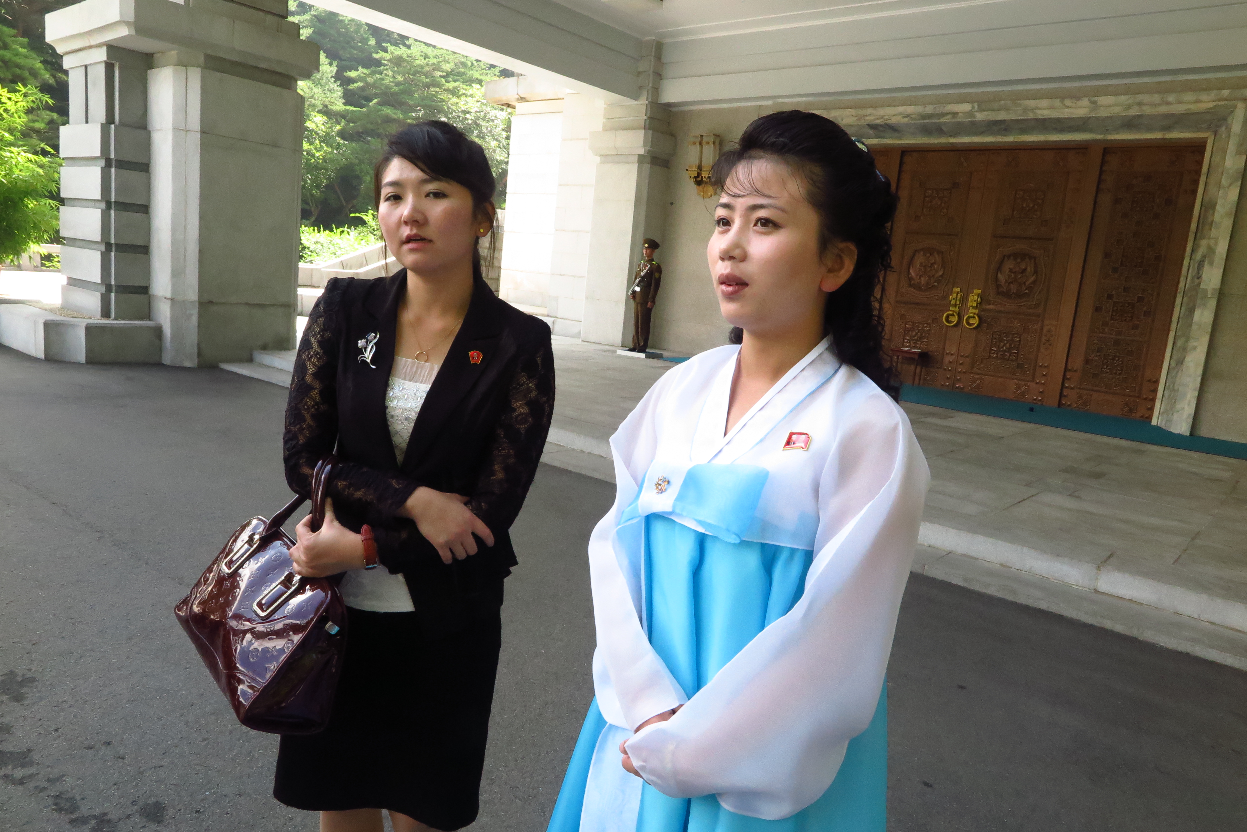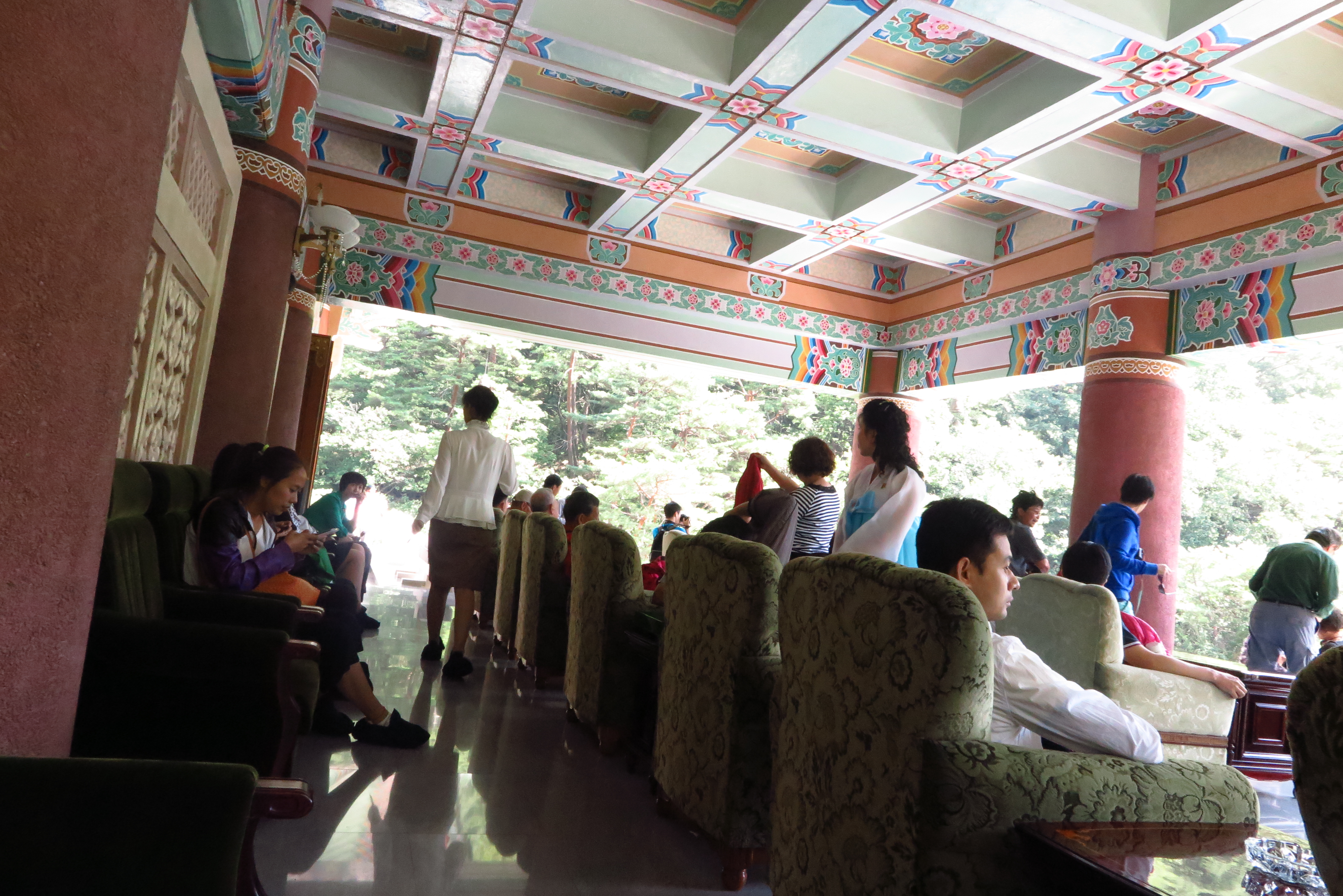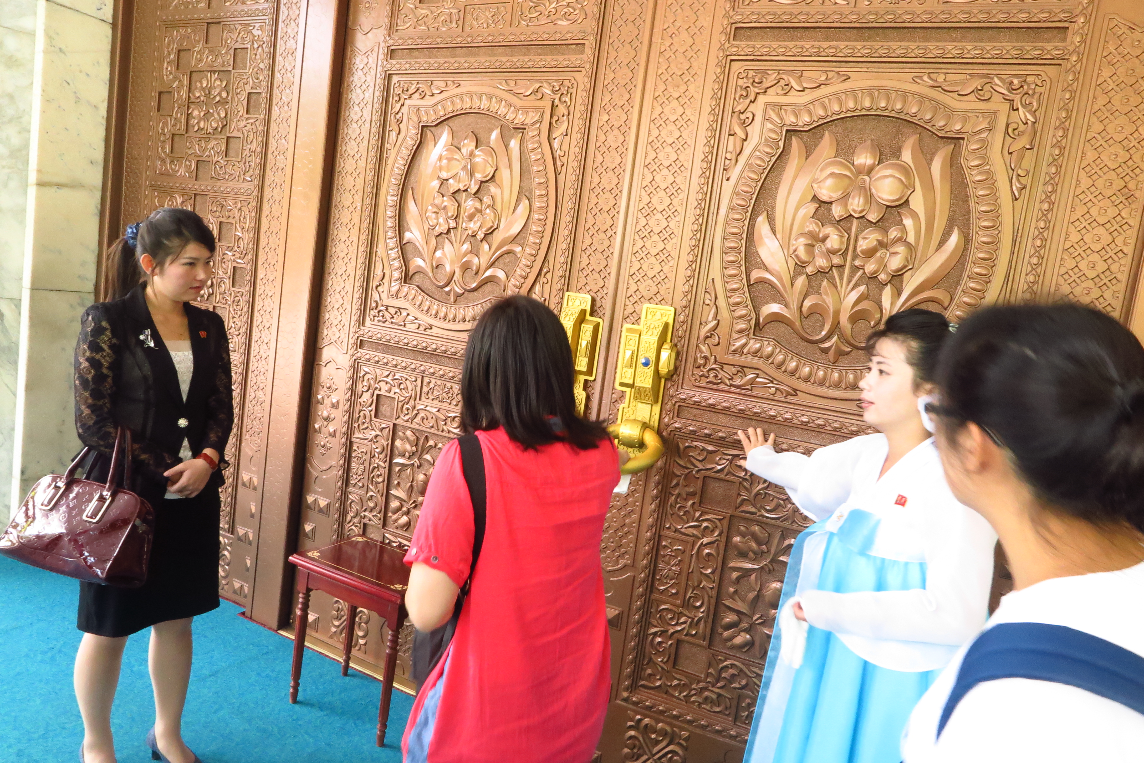 來到妙香山,首先要參觀鑿空山體內部興建的「國際友誼展覽館」,在十六噸重紫銅鑄造的大門前,先由講解員以韓語熱心介紹,呀~帶有女性輕柔的聲線講得好好聽唷!由我們的團友凱西打開噸位十足的大門,左手邊是接待處,在館內不得拍照,故必須把隨身個人物品包括攝影器材寄存,並穿上鞋套以免館內染上灰塵,也免得踩花尊貴的大理石地板,最後再經過金屬探測器及搜身,嚴格得很。展覽館神聖得像一座皇宮一樣,到底裡面有什麼奇珍異寶呢?