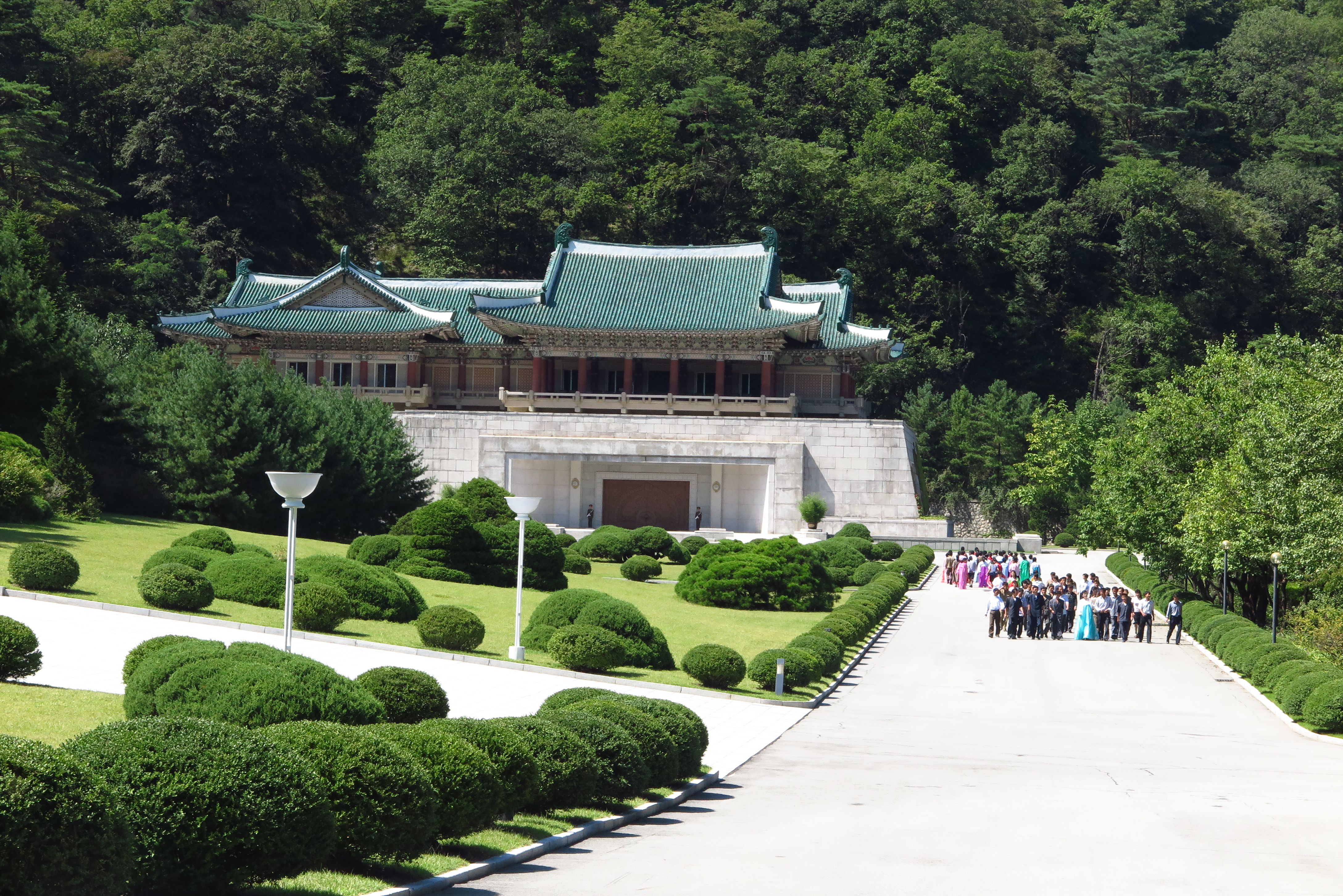歇息片刻之後,閉咀收斂笑容整齊列隊,講解員帶領我們進去比任何地方都要神聖的地方,沉重又恭敬地打開一道門,散發著上帝光的金日成雕像佇立在廳內,身後佈置成叢林一樣,廳內有鳥語聲效,四萬咁口的雕像比蠟像更有真實感,走向前迎來一陣人造風,雕像前一鞠躬,之後又有金正日、金正淑(金日成妻子)的雕像,同樣地鞠躬後再離去。去哪兒都像小學生般列隊一字排開,聽從導遊指令說東就東,說西就不敢不西,受制於人不拜也不得,好痛苦啊!差在退場時沒有倒後行,因為他不是皇帝。