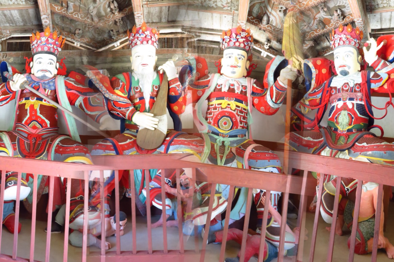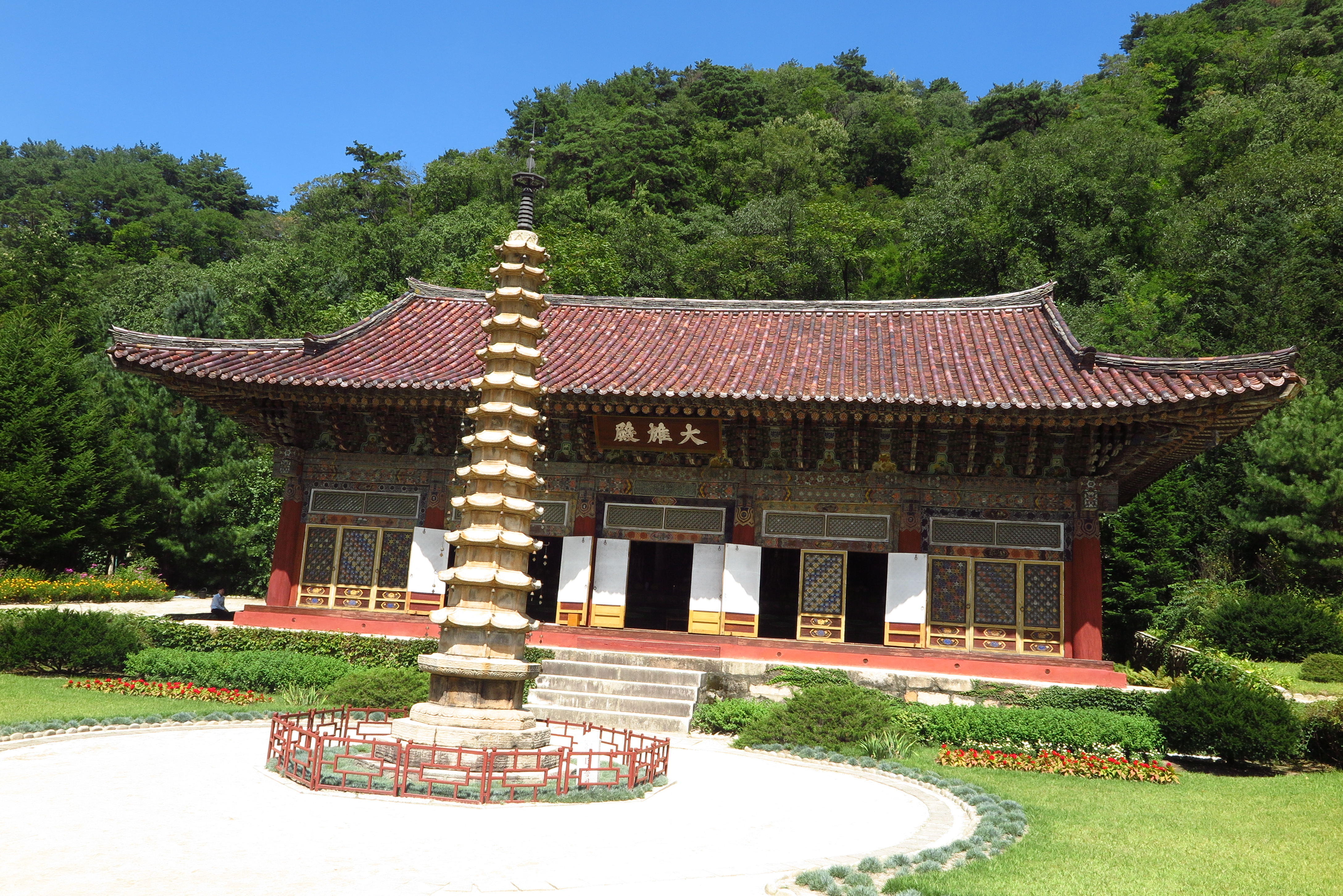 「普賢寺」為北朝鮮五大名寺之一,始建於王氏高麗時期的1402年,迄今六百餘年,走過解脫門到天王殿,內有東南西北的持國、廣目、增長及多聞的天王雕像,可是看著它的歷史痕跡似乎有翻修過,且感覺不太對路,顏色有點過於鮮艷,看起來甚為詼諧。天王殿後再來到萬歲樓,具有濃郁朝鮮本土色彩的建築,應該是講經說法、授課的地方吧,與我看古代韓劇的讀書場景都是類似宛若涼亭的地方,後方為大雄殿前院有一座八角十三層塔,每層八角塔檐往上翹起,懸掛著104個風鈴。再往前一點就是大雄殿,殿內當然有和尚,亦可供進殿參拜,不過大多團友都只是殿前路過,而我事後翻查有指大雄殿的和尚是假的,理由是他腳下穿的是皮鞋,但我並沒有注意到,也沒查證,或許老僧是安排來招待遊客的,因為整個普賢寺就只有他一人。