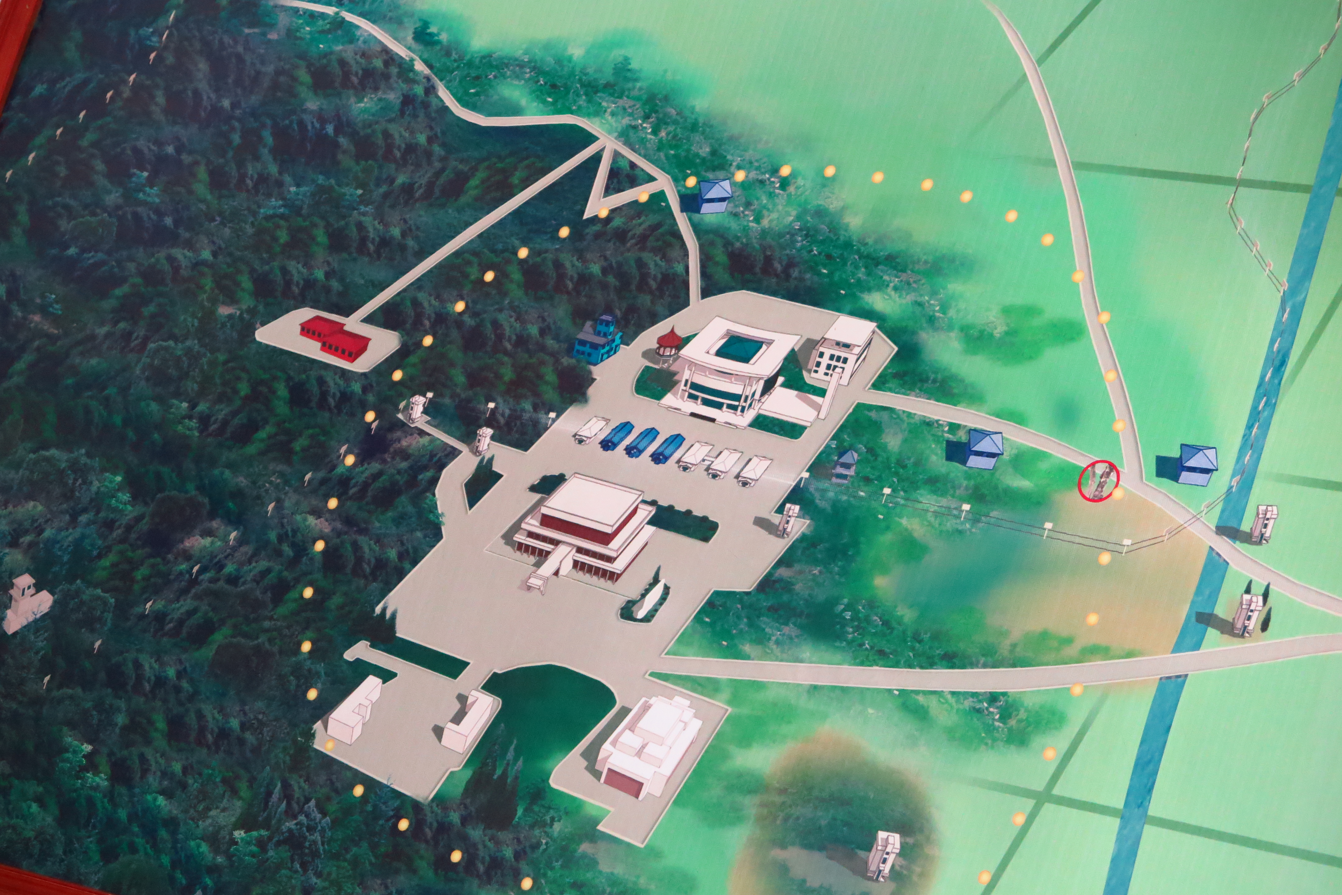 中立區會談室的作用我覺得應該淪為遊客參觀的軍事設施,畢竟會有代表國家來到板門店的中立區域與北韓對話嗎?北韓只要放導彈擺姿態就有立場了,談判並不是北韓會做的事情(不負責任的《國際評論》)。隨後登上「板門閣」的二樓平台,可以眺望南韓的邊境,南韓一方建有一棟樓高三層的現代化建築大樓,原本樓高兩層的板門閣,後來增建一層與南韓平起平坐,呀~北韓真的好喜歡「較量」。