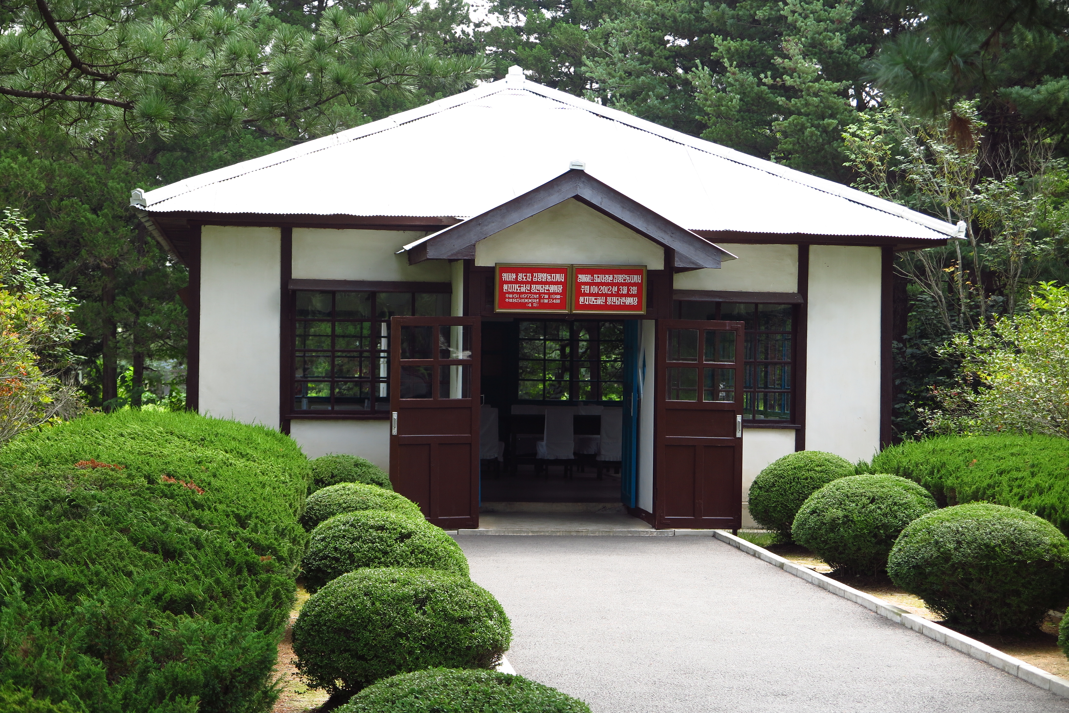 在哨所展示廳,講解軍人以地圖簡介板門店的來由,並由導遊即場以中英文翻譯,不過聚集的遊客太多,目測都有超過半百人,中途都沒再聽走到紀念品商店晃,反正我都做好功課,導遊講的我都略知一二的啦(自豪mode)。講解完畢之後就到外面一個排一個列成方陣,魚貫通過大閘進入哨所院,來到窄窄的水泥通道,兩邊都是混凝土澆築而成的一幅高大又厚重的圍牆、鐵絲網,在這登上車駛到停戰談判會議場、停戰協定簽字場外,附近有一幅宣傳畫牆,畫中為朝鮮半島地圖,標語為「為後代,留下統一的祖國」,可惜沒拍到照片,礙於當時氣氛緊張,哨兵軍人持步槍的特別多,哨所院內沒問過導遊都不敢拍照呢。