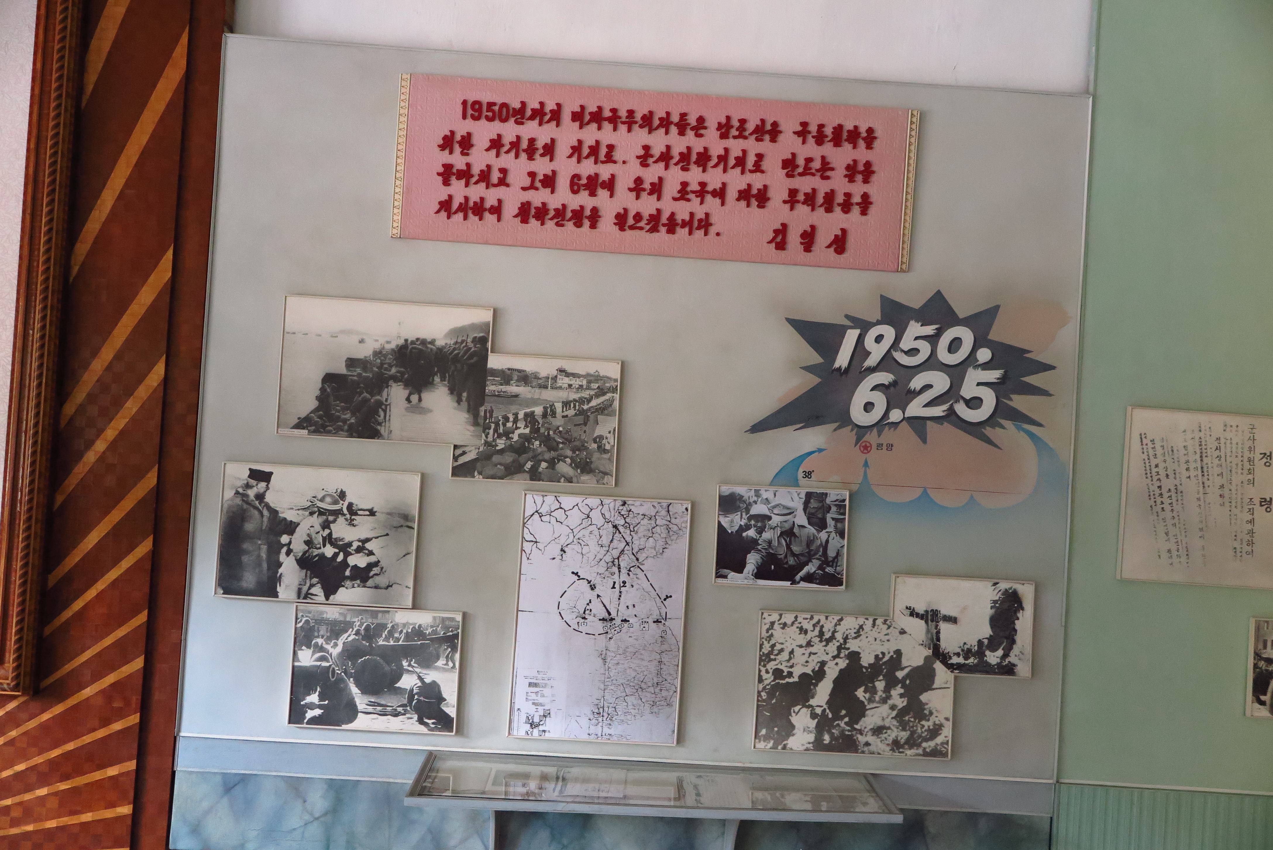 軍人又來講解歷史了,看來每個景點都要把背誦如流的簡介以中、英、韓講完一篇又一篇,滔滔不絕講述停戰談判會議場及簽字場的歷史,跟之前去國際友誼館一樣,總是講解員領在前,導遊前後包抄,我幾乎都沒再管講解員及導遊的引領,是一名不聽話的團員,在場內只顧著自己想看的東西四處晃,場內的陳設只有三張桌子,分別擺放代表著國家的朝鮮國旗及代表聯合國組職的旗幟, 而大廳周邊的牆壁張貼很多黑白彩照,介紹當時的停戰協定簽字情況及北韓的偉大功蹟。