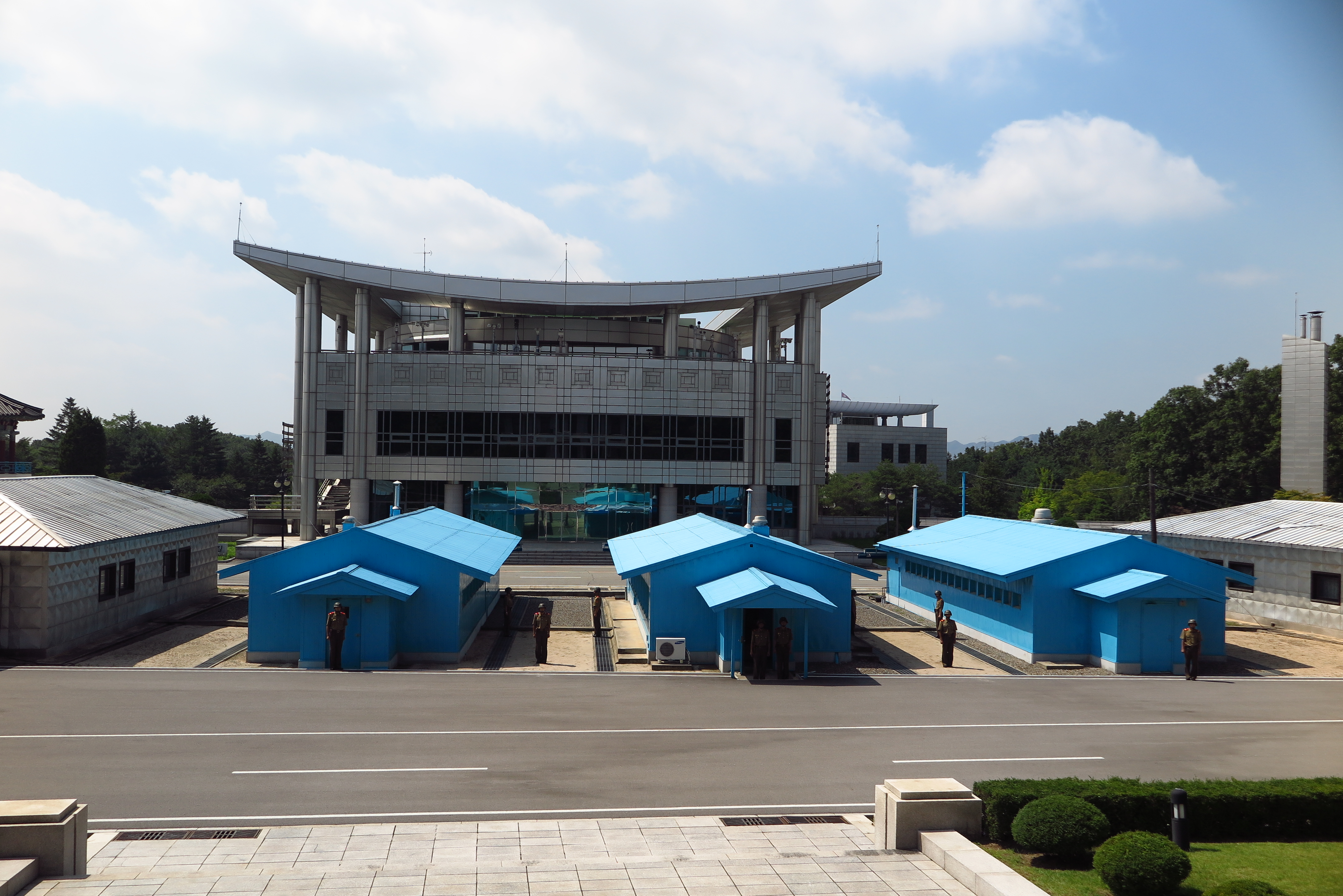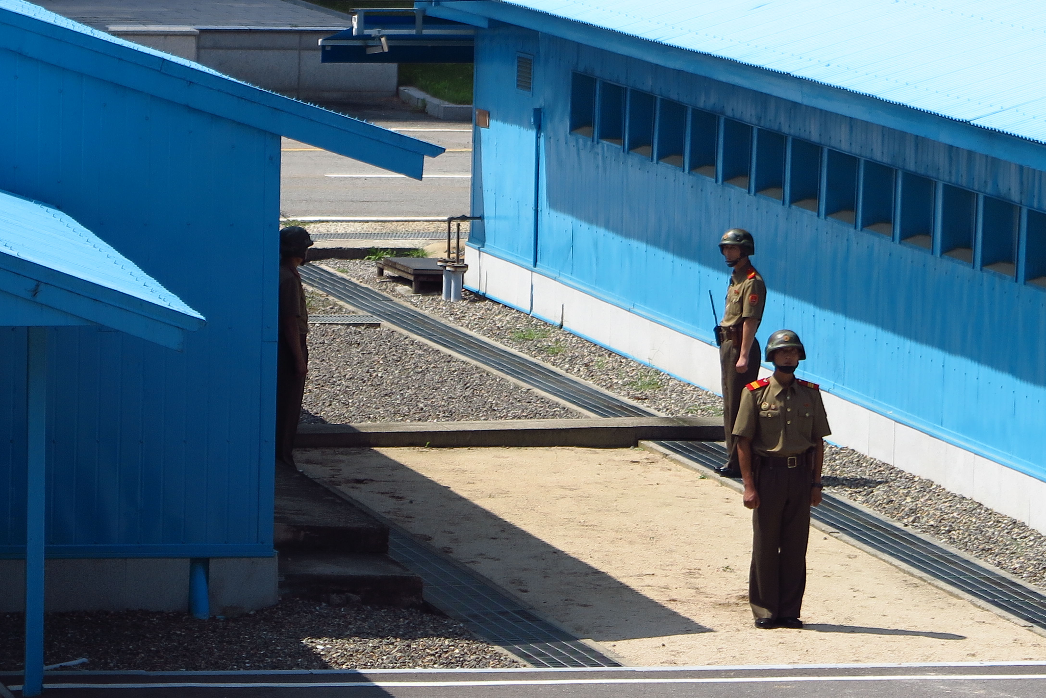來到「共同警備區」(JSA),中立區會談室是唯一一處南北韓軍人面對面守衛的地方,於遊客而言唯一有可觀性的,是參觀者可以由北韓的一端走到南韓一端,此刻的感覺不僅像南回歸線、赤道、格林威治時區線般來回行走般,它還是兩國正在軍事對峙的軍事分界線,亦即越過國界線到南韓,站在南韓的一端有兩位北韓軍人把守,有幾位膽色過人的外國遊客執意往前一點參觀(好有種!),則被軍人勸阻不能再往前,以免太靠近南韓一方引起一場不必要的外交風波,其實我也嘗試走得更前,在南韓大門前打卡拍照,不過這肯定會挑起軍官的敏感神經。