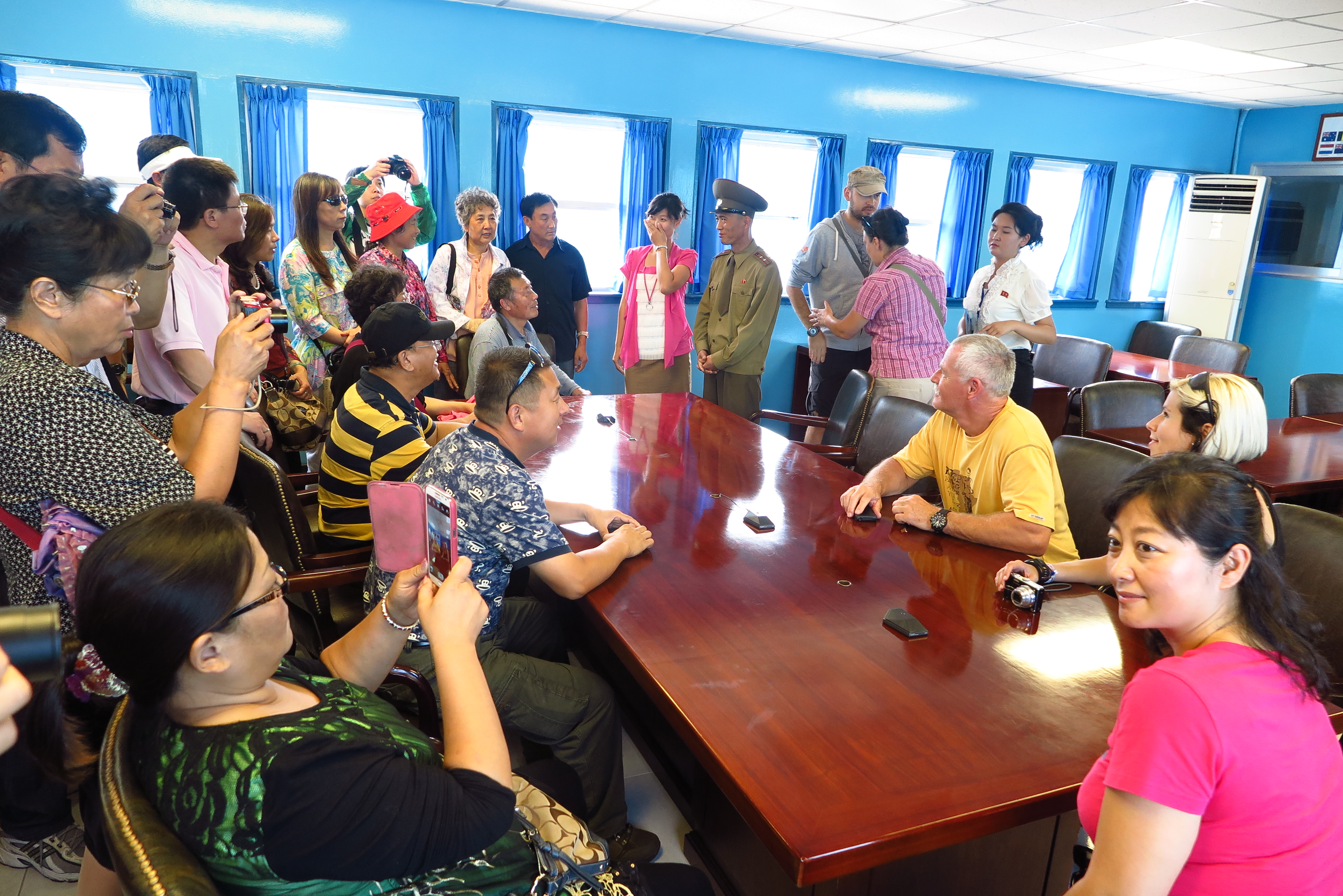 在共同警備區,我們在會談室、平台均能夠自由的拍照,不過有一些軍人並不喜歡被拍,總會板著臉給你看,但是禮貌詢問非站崗的軍人拍照,是可以的,而且要找個帥氣的軍人一起合照唷!到最後講解軍人把我們送到板門閣後的停車場,大家都嚷著要跟他合照,我也不放過啦,他後來有笑啦,和藹親切得多了!