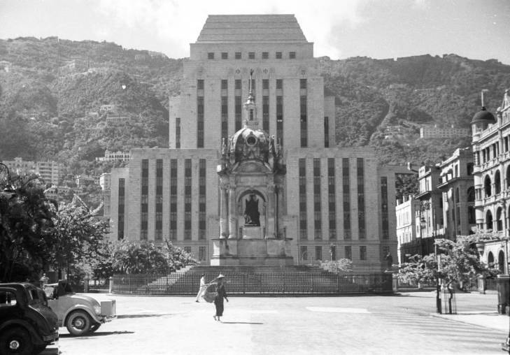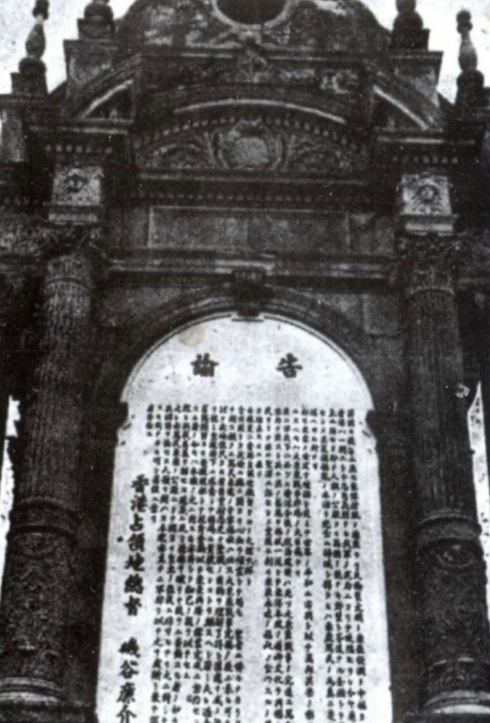 直到二次世界大戰香港淪陷,日軍佔領香港三年八個月,皇后大道一度更名為明治通,由於戰時缺乏金屬原料,日本社會發起「獻銅運動」徵用軍用物資,殖民象徵的銅像被日軍拆走運到日本,打算熔化為金屬材料製造武器,隨後日佔香港總督磯谷廉介將《香港佔領地總督告諭》石碑鑲嵌拱頂亭上,碑文提及英國乃「人類公敵」,又強調侵華戰爭實屬「聖戰」,港人應該「共同協力」以完成「大東亞戰爭」,其語調之霸道後世無來者!