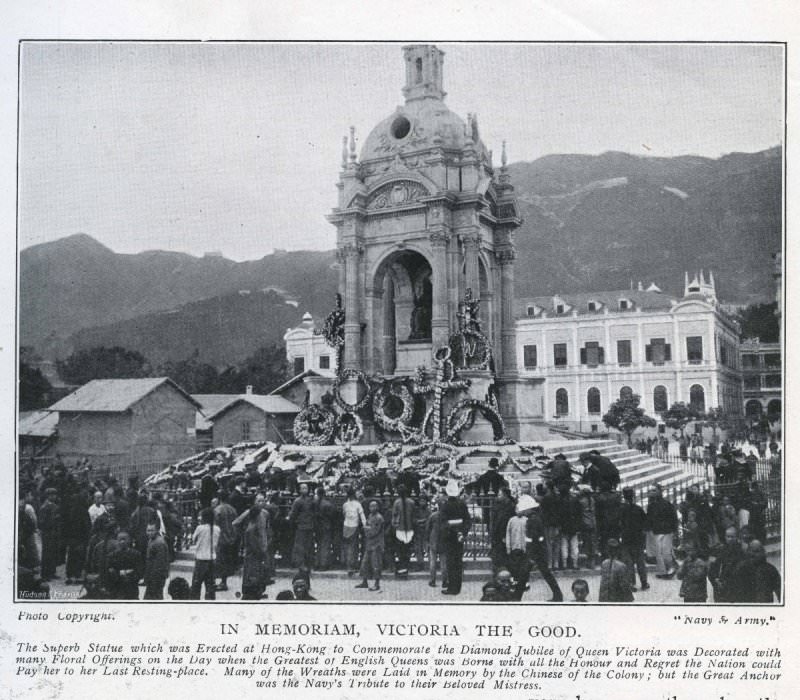 香港的維多利亞女皇銅像是為慶祝登基50周年而鑄造,1887年香港政府向英國訂製女皇銅像,及後1890年鑄造完成,先在倫敦展出後運抵中環遮打道,是當時的權力心臟地帶,三噸銅像安放於一座拱頂亭內,拱頂亭版的維多利亞女皇銅像,豎立在十字路口的正中央,銅像置於立體梯形之上,比起維園現貌顯得非常有氣派,廣場北部放置多尊英國皇室成員的銅像,全盛時期皇后像廣場裡共有9個銅像,包括上海匯豐銀行總經理昃臣爵士,而東側也設置和平紀念碑,紀念第一次世界大戰的陣亡將士。