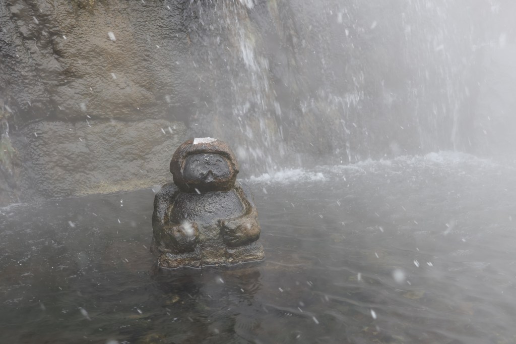 接著來到定山溪泉源公園,有一尊定山僧侶的坐像,木碑文寫著温泉區的開拓史,美泉定山是幕末時期來自備前国(岡山県)的行腳僧,與阿伊努人雲遊此處發現湧出泉源,逐在豐平川築建水療設施,可以看到坐像後面的石縫間湧出熱泉水,迷霧像極了仙氣,走累的話也能享用腳湯設施。我有打算經泉源公園走下去河谷,或許有路去豐平川的「河童淵(Kappa Pool/河童巢穴)」,可惜雪襲之下路難行,積雪多得雙腳陷入雪裡,陽光折射白雪的強光有點眩,降雪也愈來愈大,不得不回頭,行快兩步揸車閃!