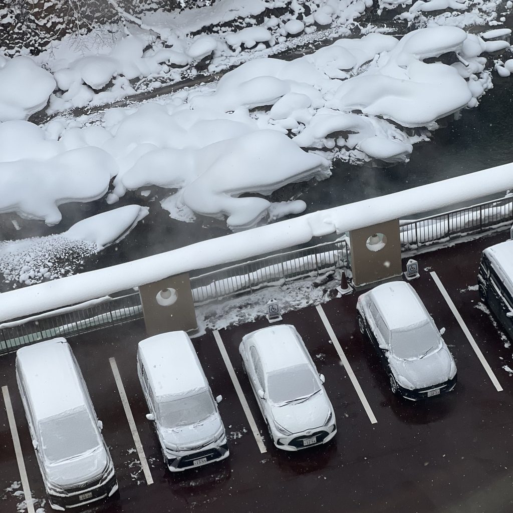 很喜歡日式旅館的傳統榻榻米地板,吃完晚餐回來鋪好床鋪,每次看到仍覺嘖嘖稱奇。宿泊像是一種儀式感,即便穿上浴服,到底左襟右襟還是搞不清楚,但我很享受「假裝我是昭和時代的日本人」,這次訂到的榻榻米房間,窗外晨光照耀定山溪的山川河流,我的車就停在這麼美的地方,這是我想看美如畫的山巒雪景,也沒有很商業或過多的外國遊客。