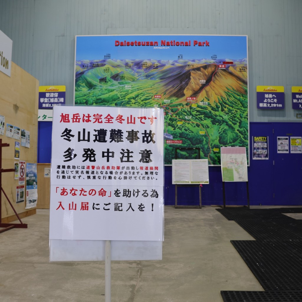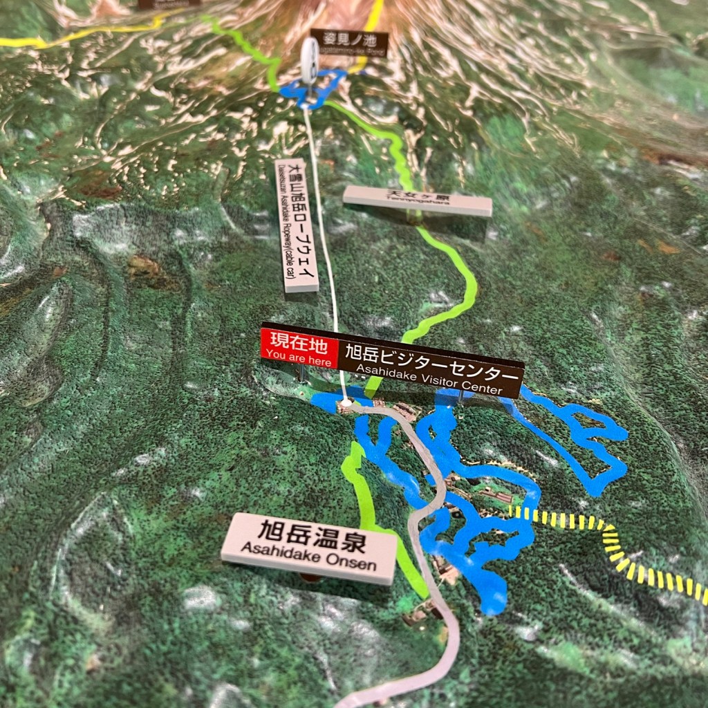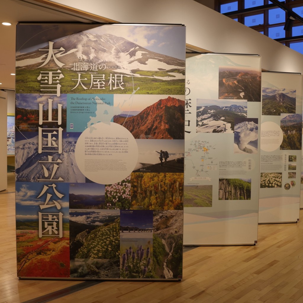 到達遊客中心,是個登山健行的資訊中心,有大雪山的地形簡介、登山情報、危機指引等,譽稱為「北海道の大屋根」的大雪山國立公園,兩座活火山由大雪山至十勝岳的山峰,山脊與山谷連綿交織,當中有地獄谷、噴氣孔,以及豐富泉源的溫泉區,之所以來到旭岳溫泉一泊二食,翌日搭纜車登頂欣賞好風光;此外,這裡也有小小的資料館介紹雪山上的動物,其中有雪貂、雪兔、雪鹿、雪狐狸,嗯~千萬不要遇上棕熊!