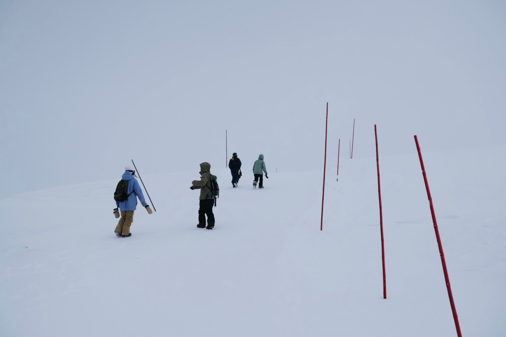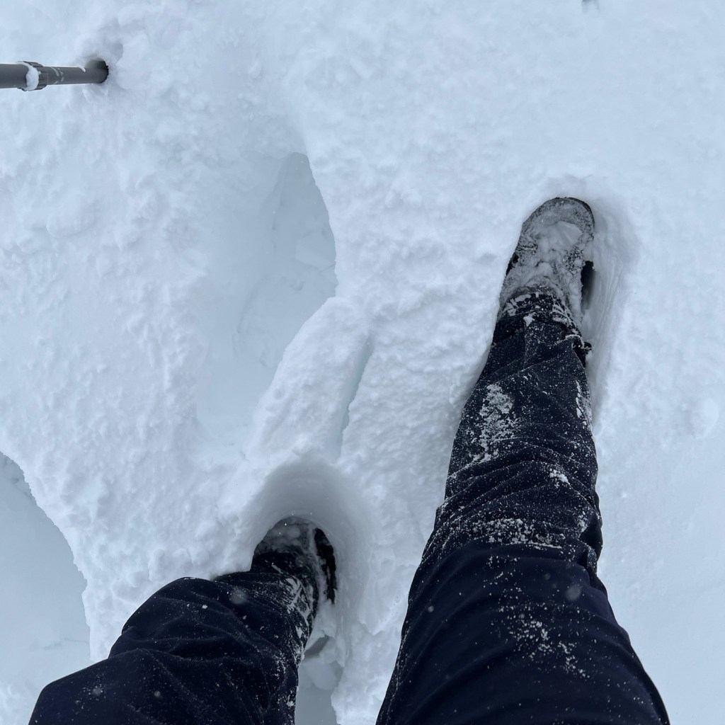 雖說大雪山主峰「旭岳」海拔2290米,實際上並沒有登頂,姿見站海拔1600米,本應有一公里多的登山步道,睜大金睛火眼掃視四周,山徑步道、姿見池、地獄谷、旭岳主峰等通通都看不見,積雪讓山上的任何一處都有機會踏空,更擔心差錯腳會凌空滾下山,而不敢往左右繞行。雖有醒目紅色的引路標記杆,然而強風下捲起雪粉能見度超低,雪白籠罩山頭不見一絲天空,每隔十幾步都會偏離步道,打開谷歌的實景地圖照著走,但其實我們要去哪?四周白得耀眼不能辨別方向、無目標的前行,那種質疑讓我決定回頭,沿著足跡返回姿見站。