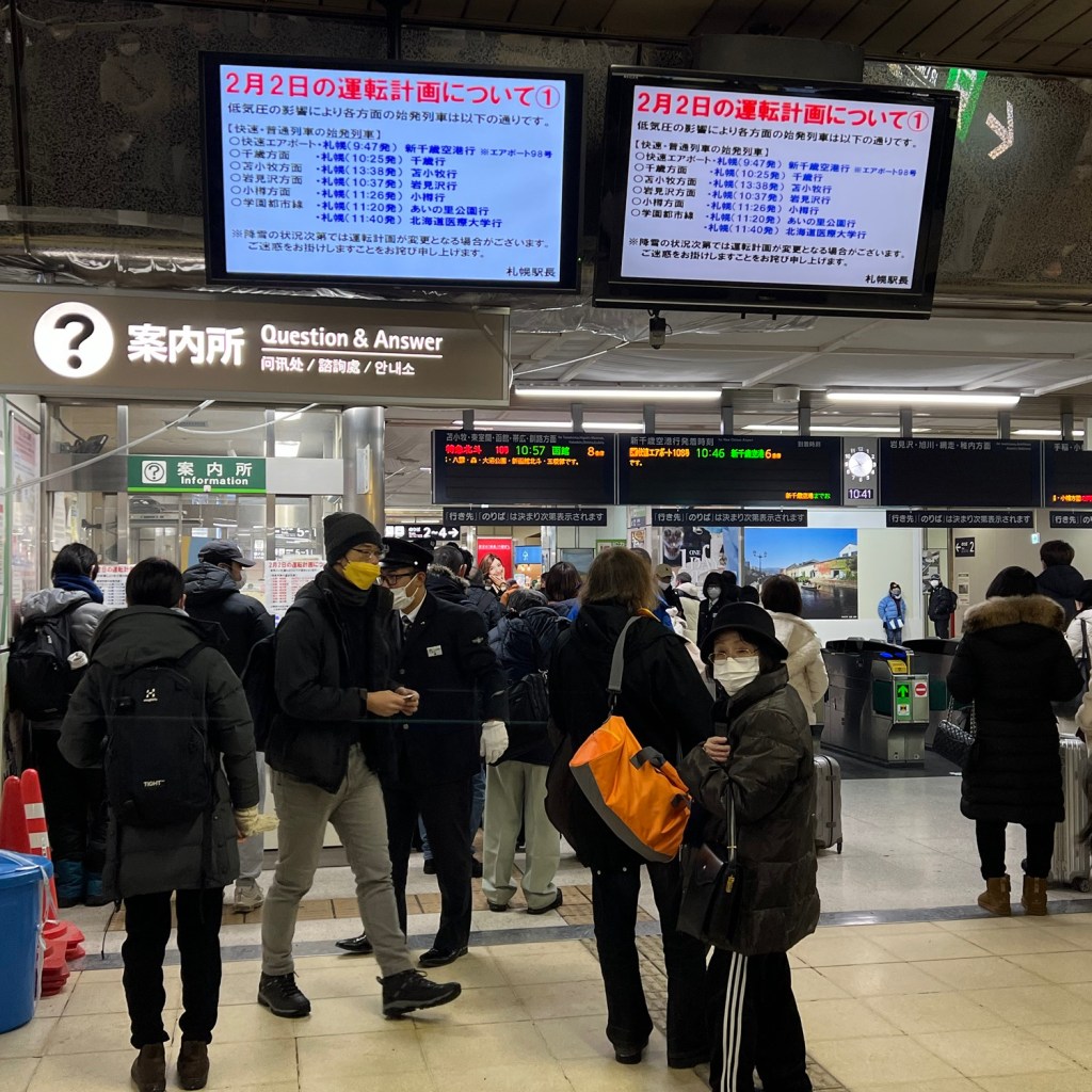 沒有過於焦慮,旅程中的突發事件常見,每每讓我感到刺激且樂趣,畢竟難得遇到「風吹雪」,只是大雪之下,在雪地上「拖行李」找酒店搞得我們超累!加上晚睡早起(旅行不都這樣嗎XD),好像有點作病,但仍不減我對旅行的熱情,趕快吃微粒感冒藥墊底,翌日依然晨咁早起床,打開電視得知多條鐵路線仍然停駛,趕緊到櫃檯詢問最新的雪災情報,僅知道會有「復駛時間表」,決定打包行李退房,把行李寄放在札幌的下一間酒店ーJAL Hotel,隨即出發札幌站。