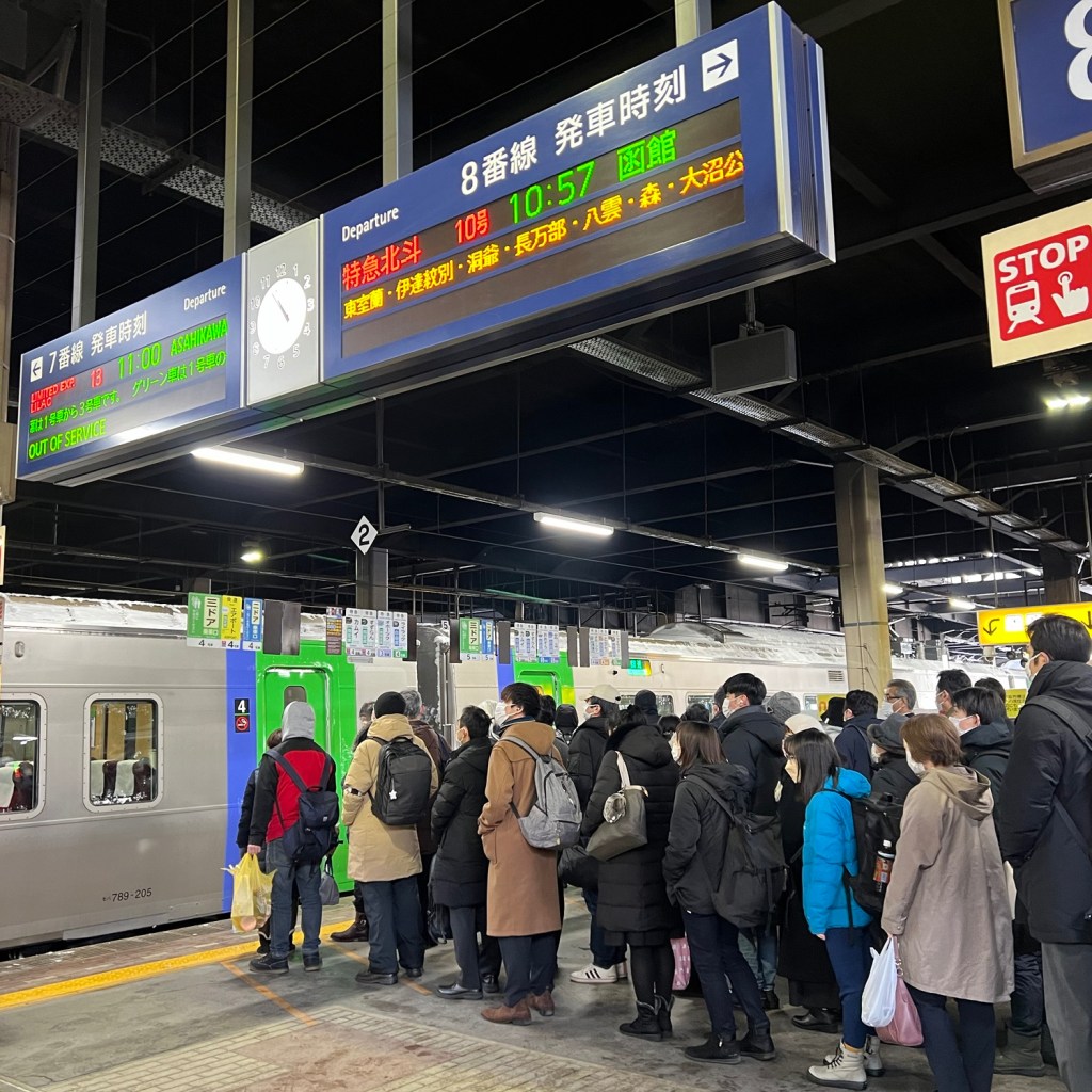 大堂聚集人潮,大多為了趕上鐵路復駛的首班車,在張貼通告上找到往旭川的「紫丁香13號列車」,將於午前1100開出第一班,我們必須登上這個班次,才能接上之後的原定行程,即是11點前要離開札幌站,抵達旭川就能剛好趕上溫泉旅館專車,慶幸繼續行程沒有改變,只是三小時的車程匆忙又驚險,旅行魂都回來了。