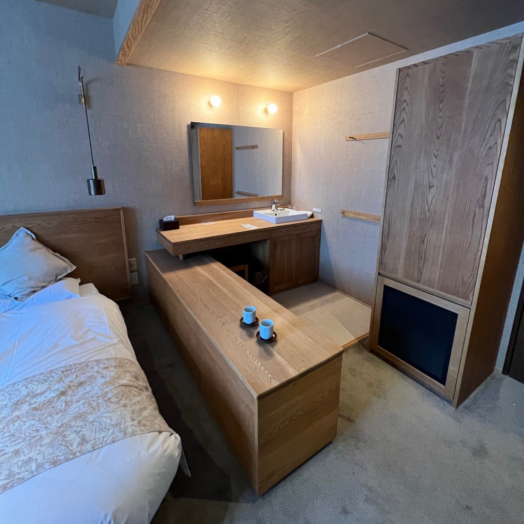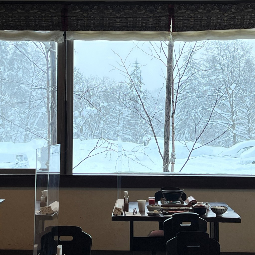 天黑前趕下山回到溫泉旅館,我們入住的房間名叫「淡雪」,有很多小巧思的享受空間,開放式洗手台與廁所分離,旁邊有個小小的長檯延伸,也有沙發茶几,窗外正對著我們剛來的路上。木系裝潢的溫泉旅館實在太合心意,泡個抹茶暖暖身之外,也有傳統天然木的手搖磨豆機嘆啡,把時間放慢就能享受溫泉旅館該有的品味悠哉。晚餐到地下一樓的大雪廳,品嚐暖笠笠的知床豬肉火鍋放題,鰹魚湯底雖然簡單但非常清甜,吃到超多份量的兩盤豬肉,烚下蔬菜沾醬吃,吃著笑著都不知飽,最後一道甜品有白咖啡布甸,ぷるぷる~