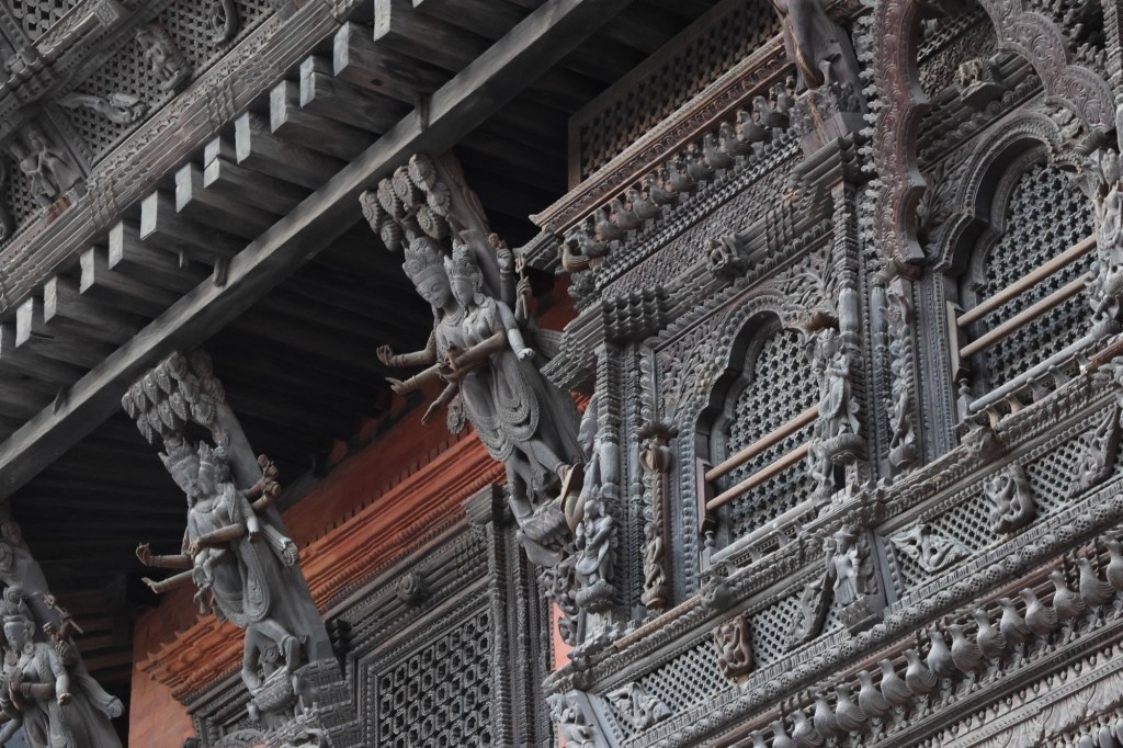 帕坦城比起加德滿都更為精緻,形式各異的紐瓦麗藝術大放異彩,有支撐柱的立體雕刻、門樑的雕刻立面等,比起加德滿都有更多與佛教相關的建築或雕像,對我來說多了一分親切感。而三大杜巴廣場之中,這裡的可看點是王宮改建的帕坦博物館(Patan Museum),沿著老舊的木造梯級爬上閣樓,嶄新企理的博物館呈回字廊,能夠近距離觀察木雕藝術的組件細部,雖然大部分掉色還原木頭的啡紅色,仔細看仍可見殘留斑駁的色彩,也收藏很多宗教文物的擺件。可以想像在馬拉王朝的鼎盛時代,整個帕坦城有多麼美麗的繁華景象,很嚮往藝術水平高的時代,說起來有點像唐朝的盛世國度。