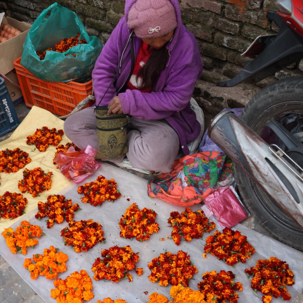 第一站先到加德滿都杜巴廣場,從旅館徒步過去,愈靠近杜巴廣場,宗教氣息漸濃,首先看到的是印度寺廟,附近有個印度教祭壇正在擺設,鮮豔奪目的橙黃色花瓣櫛次鱗比,靚得很有治癒感,祭壇旁邊有個人在煮鷹嘴豆,拌上咖哩在廟前供齋派飯,現場散發著相當濃烈的豆香氣味,趕廟會的人潮焚香點油參拜,整個畫面看下來猶如盛大慶典,果然「香火鼎盛」!看在眼裡忙得有點反應不過來,視覺衝突的程度是前近未有的,衝擊眼球看呆了。