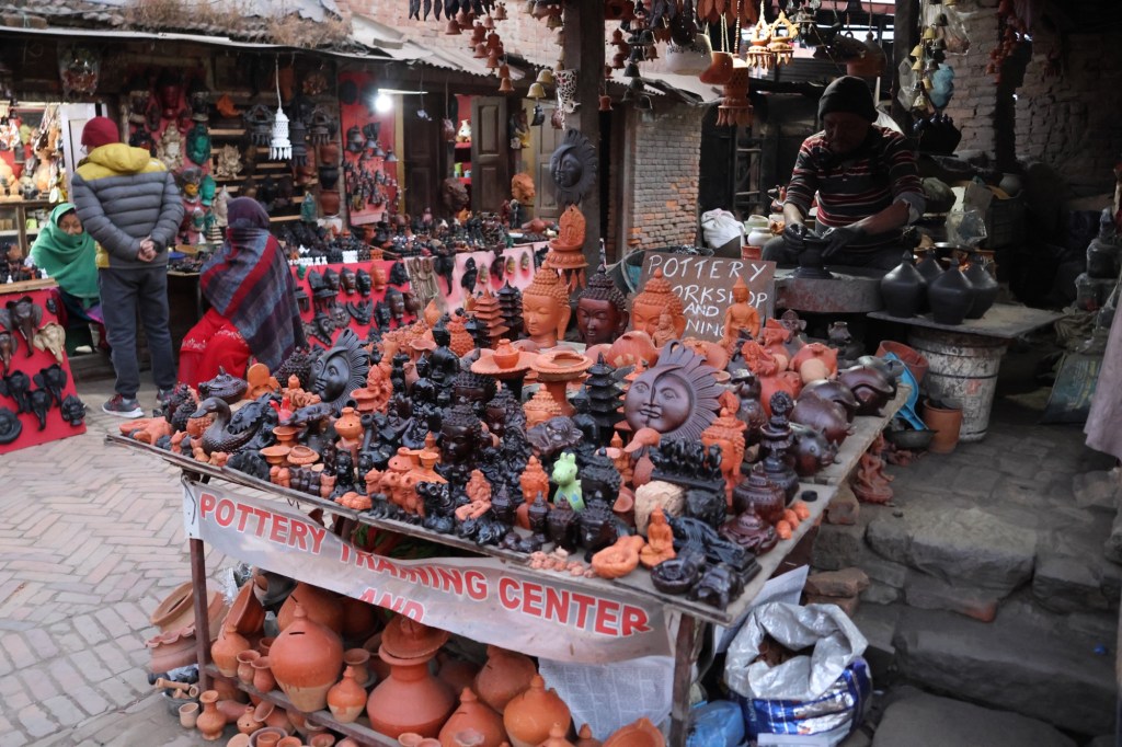 又瓹罅到巴德崗另一重要據點陶器廣場,盛極一時的陶器廣場曾經大規模生產、交易,如今作為一個藝術展示的小廣場,陶器製作仍見於當地人的每天生活,地上擺滿正在拱乾的陶器,還有形形式式的手工藝品販賣;繼續在周邊逛,經過一間油畫店,老闆的樣子像一個瘋狂畫家,多幅亂疊的畫作、油彩污漬凌亂,我反倒欣賞這種「藝術性格」的畫店,看中一幅畫作關於尼泊爾登山,於是買了;接著又買明信片、磁石貼等,該買的東西都在這邊買,主要因為這裡光顧的是普通商舖,幾乎沒有像旅遊區一式一樣的商業手信。整個巴德崗古城很立體,並不像前兩個杜巴廣場,都在加德滿都現代城市所包圍的古城,而杜巴廣場不盡然是有圍籬的景點,更像是走入曾經自成一國的城市中心,古城裡有宮殿、博物館、地標建築的塔寺廟宇,城街小巷有菜市場地攤、陶器工場、咖啡廳等。這裡的不規則卻不雜亂,愈看愈像香港深水埗,像在寶庫此中尋,這樣遊玩才有趣啊!