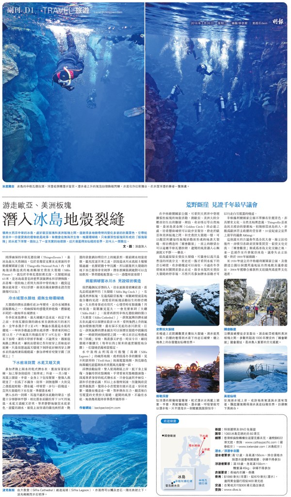 橫跨大西洋中脊的冰島,處於歐亞板塊和美洲板塊之間,造就很多地貌奇特而變化多姿的壯麗景色,它帶給你其中一份最寶貴的禮物就是純淨,有機會在無海洋生物、瑰麗珊瑚礁,只有擴張性板塊所形成的「板塊裂隙」的水底下浮潛,猶如上了一堂充實的地理課。這片湛藍得如仙境的世界,足叫人一潛難忘。
