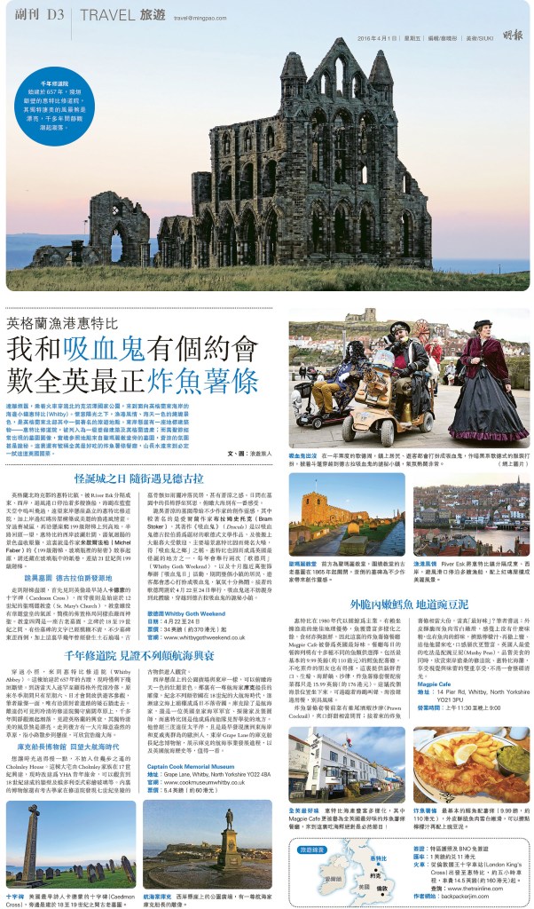 遠離煩囂,乘着火車穿過北約克沼澤國家公園,來到面向英格蘭東海岸的海邊小鎮惠特比(Whitby)。愜意陽光之下,漁港風情、海天一色的旖旎景色,是英 格蘭東北部其中一個著名的旅遊地點。東岸懸崖有一座地標建築物——惠特比修道院,被列入為一級登錄建築及英格蘭遺產;而萬聖節經常出現的墓園圖像,實境參 照地點來自聖瑪麗教堂旁的墓園,蒼涼的氛圍甚是詭秘。這裏還有號稱全英最好吃的炸魚薯條餐廳,山長水遠來到必定一試這道英國國菜。